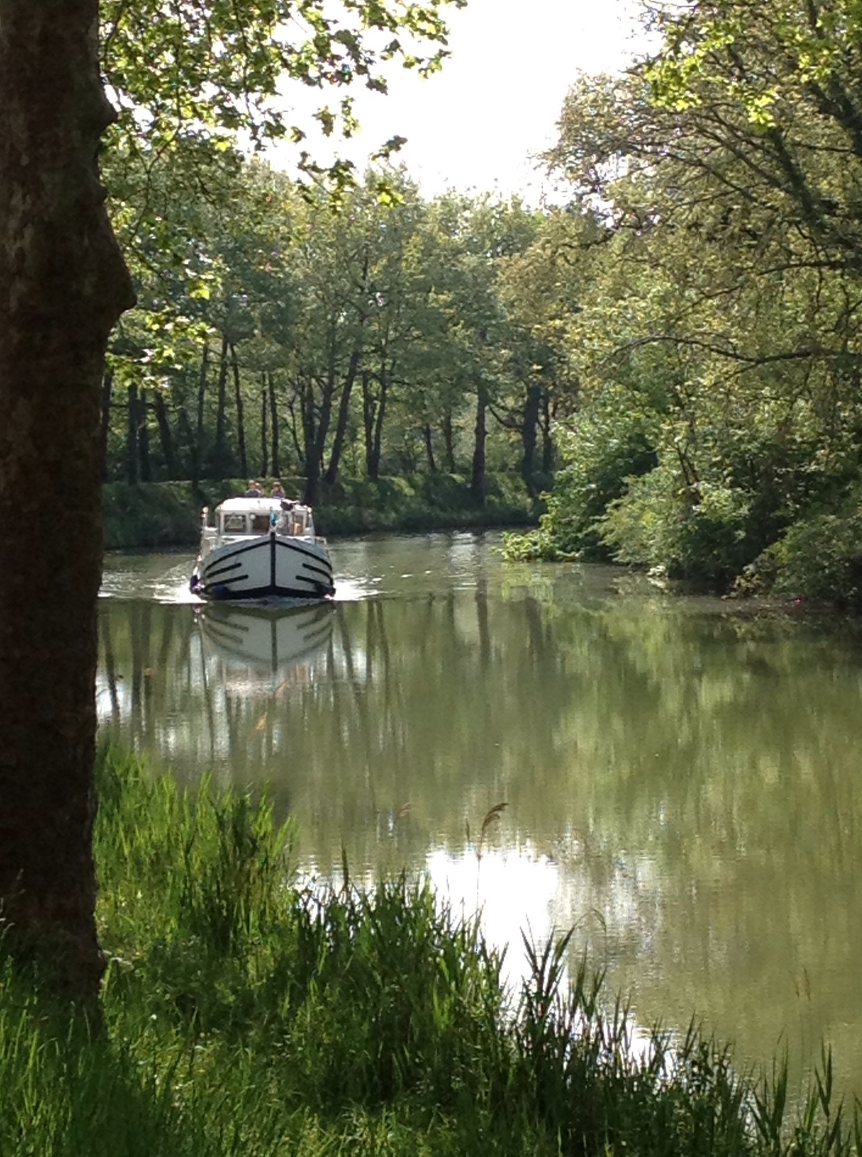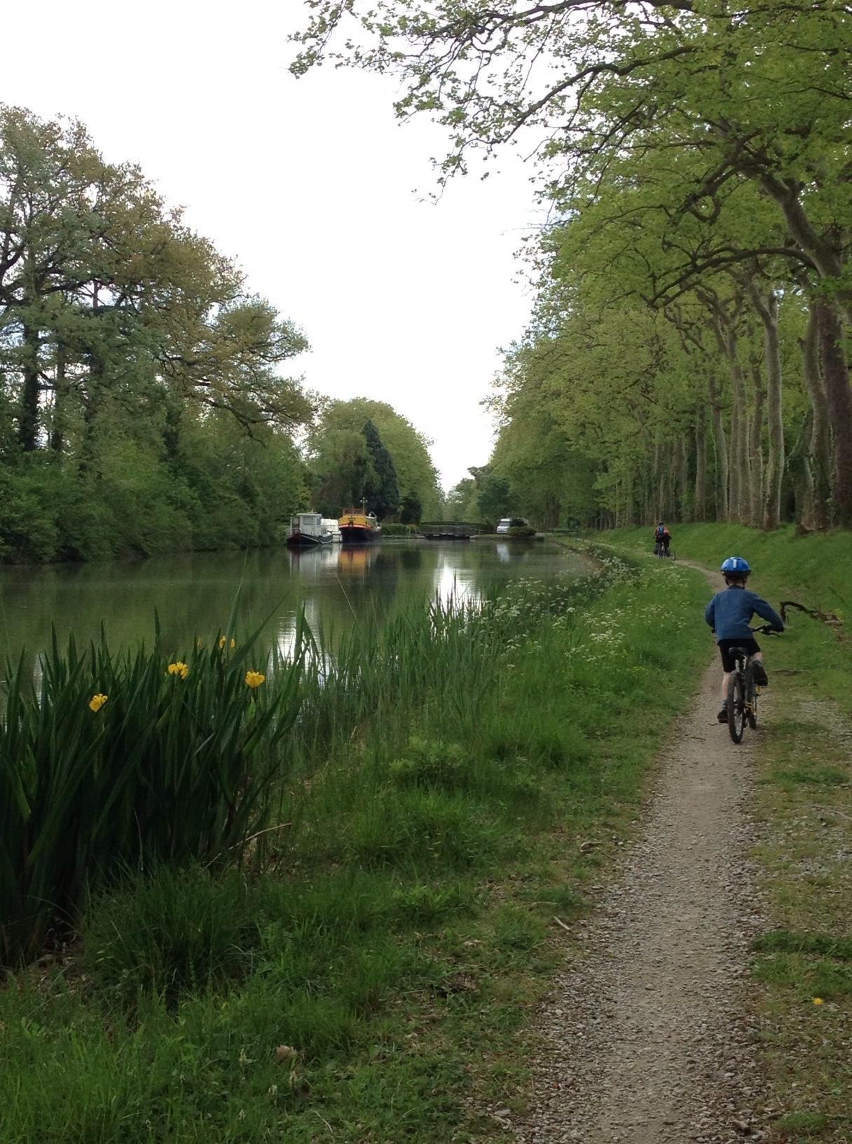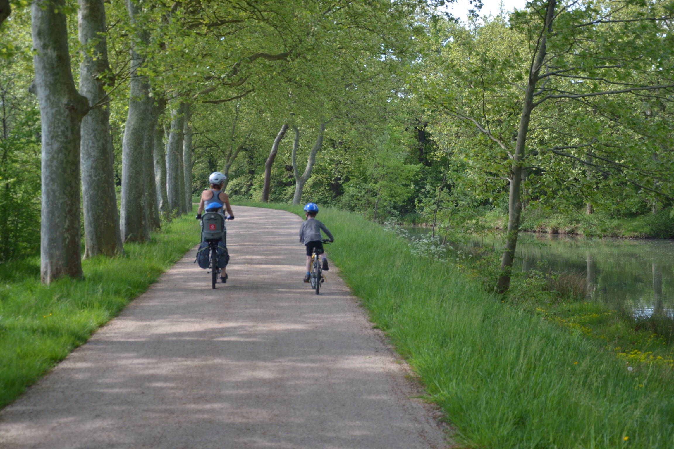 Partis sous le soleil mais un peu tard, après un petit-dej pantagruélique grâce aux bons soins de notre hôtesse, nous avons poursuivi la partie facile du canal: une large allée goudronnée bordée de magnifiques platanes. Ça roule, ça roule!