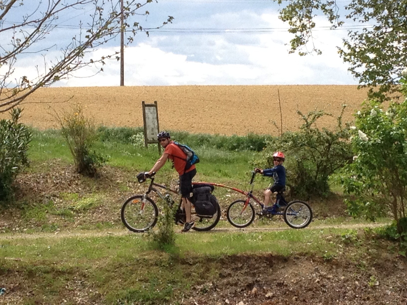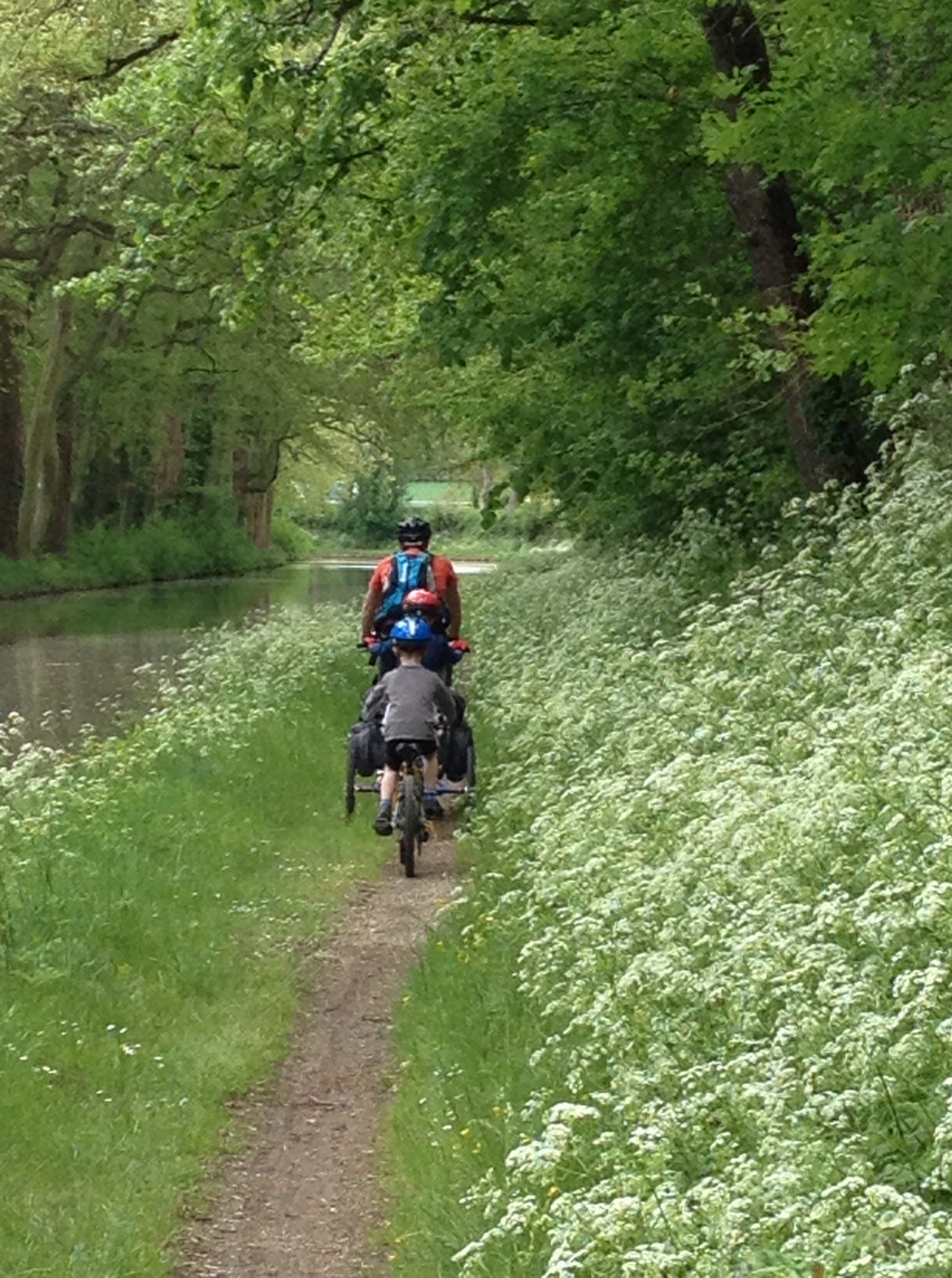 Nous quittons l’allée goudronnée pour mettre à rude épreuve les roulettes des 3 ti-gars sur un chemin de halage étroit, très étroit…