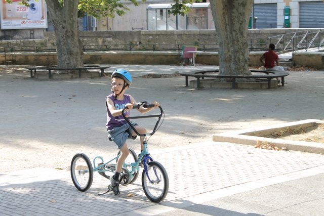 Au quotidien, Quentin a besoin de ses roulettes pour se déplacer sur des distances un peu longues et pour être dans le groupe. Après avoir appris à faire du vélo avec de petites roulettes, il est maintenant un champion du tricycle à grandes rou(lett)es. Sur son tonicross, il pédale seul et en toute confiance.