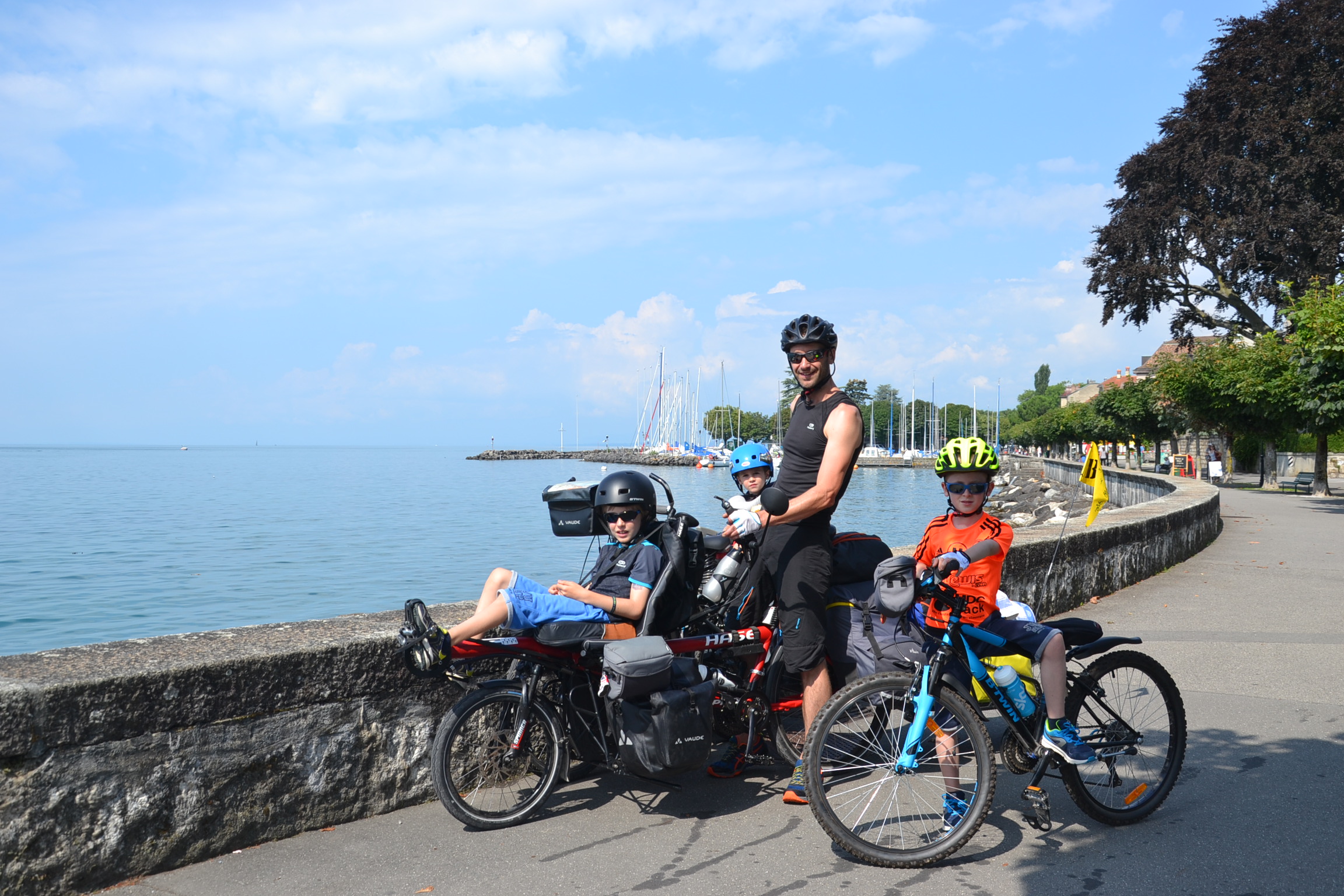 Les 18 km de montée interrompue ont eu raison de mon moral et de mes jambes : Matthieu a fini la dernière côte à pied, après avoir passé quelques km sur le tandem de son père transformé en mule pour l’occasion!