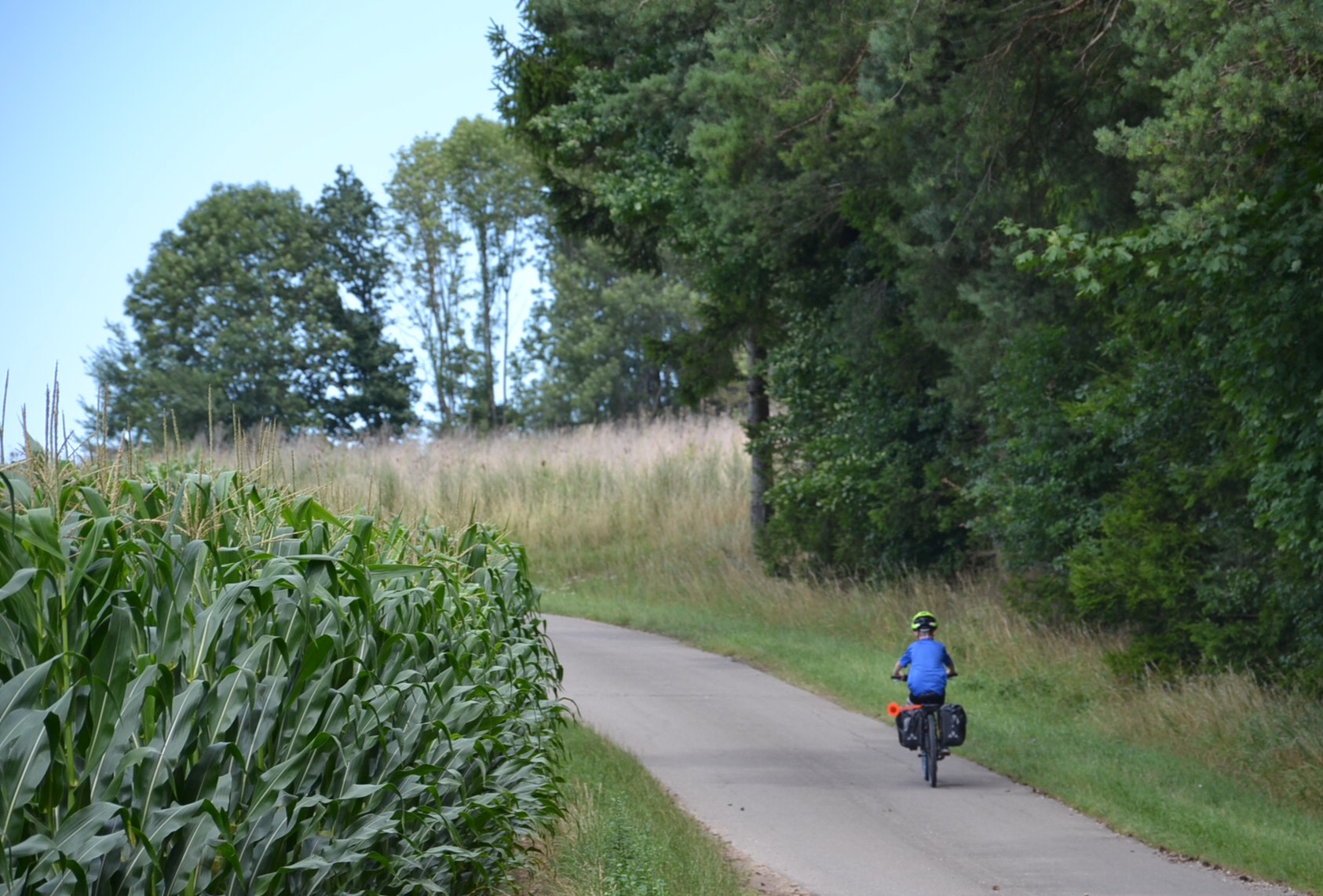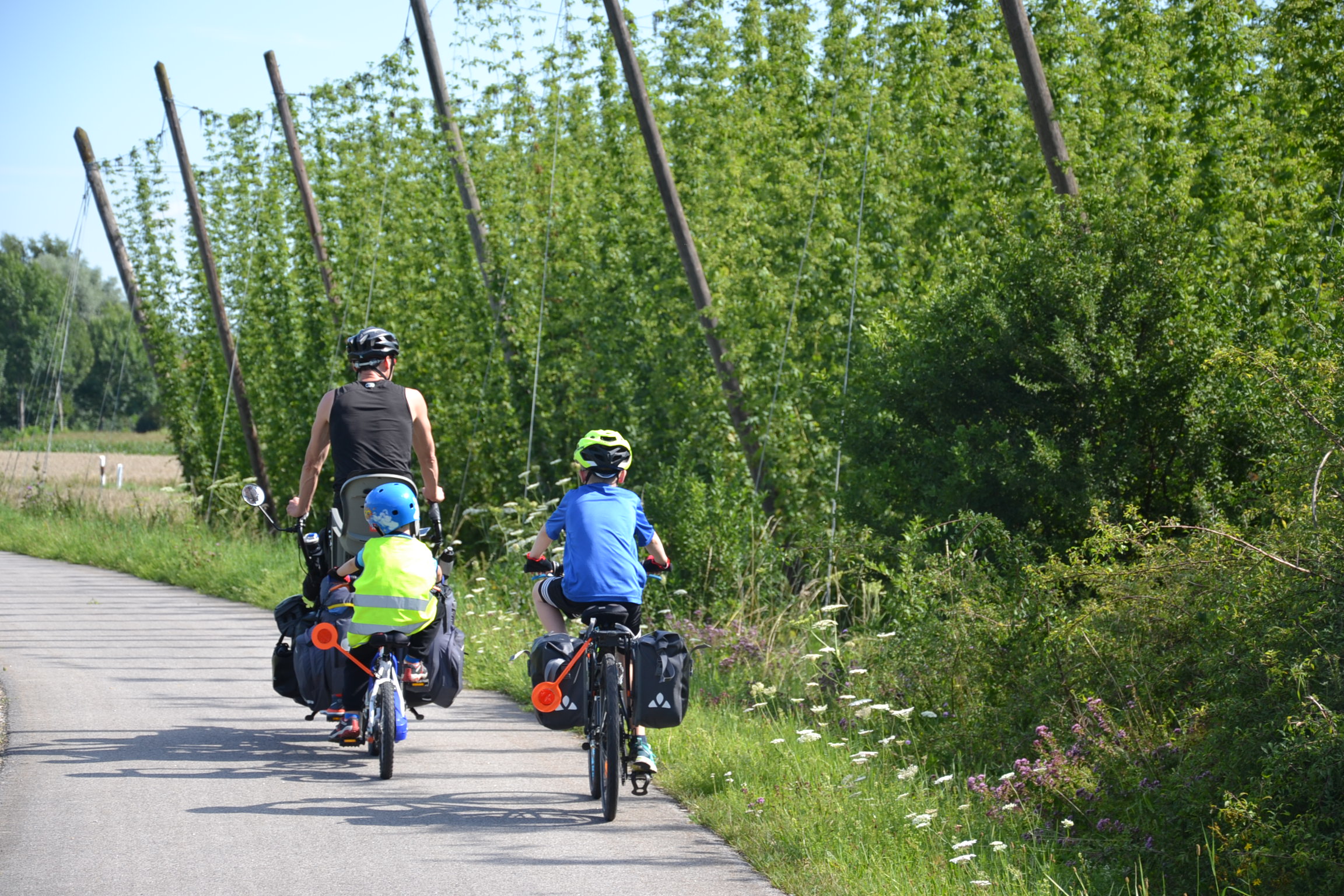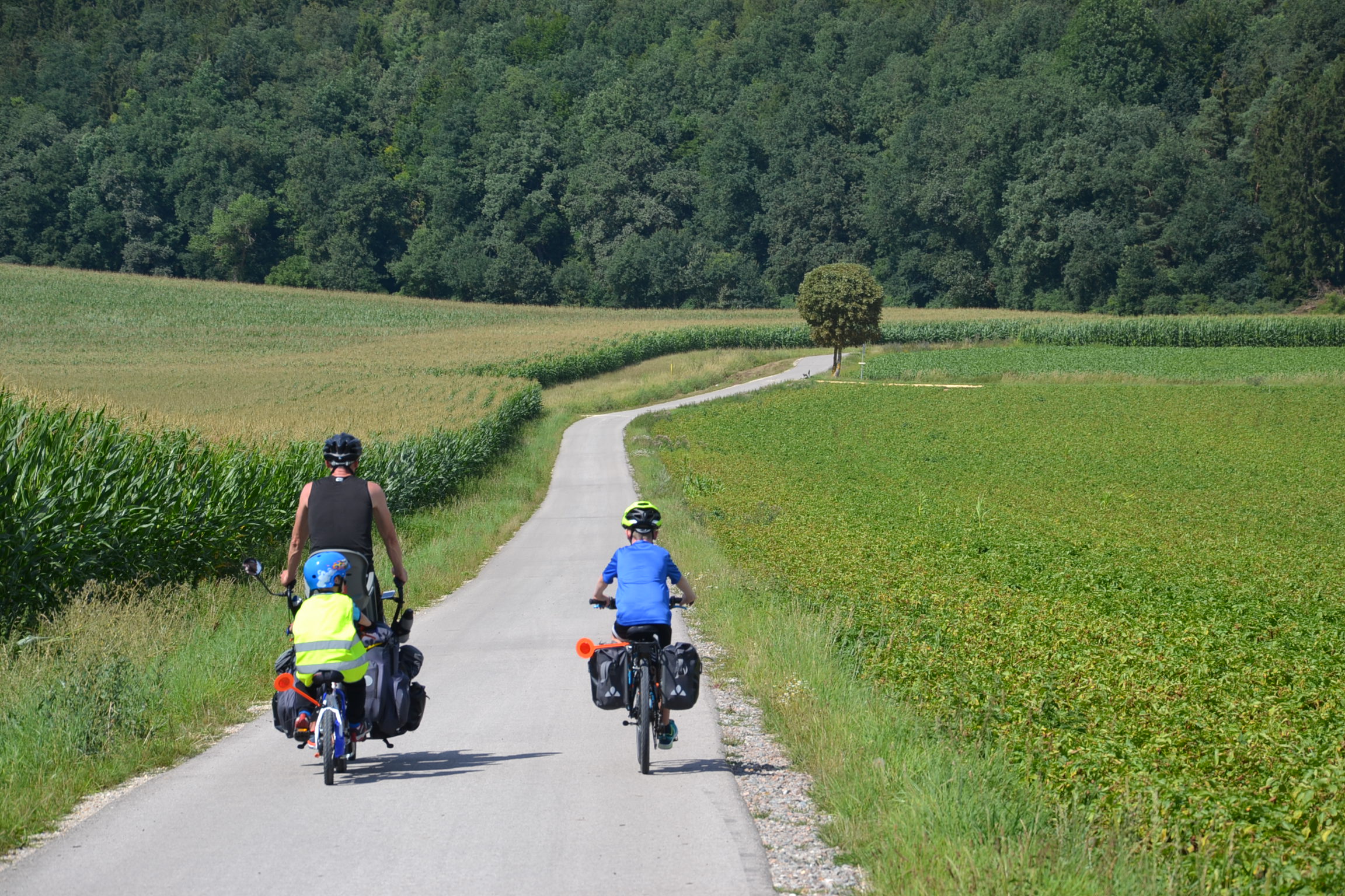 Notre bonne fortune a mis sur notre chemin un couple de e-cyclistes (un concept qui fait baver d’envie nos 3 ti-gars) qui nous ont accompagnés un bout de chemin. Dès la première montée, ils nous ont quittés non sans nous avoir laissé un renseignement plus que précieux.