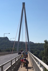 Le passage le long d’une immense saignée dans la forêt fut l’occasion d’expliquer aux garçons le projet de détournement du Danube pour la construction d’une centrale hydroélectrique au sein du parc national dans les années 80. De ce projet contré par les Verts autrichiens, il reste aujourd’hui cet immense pont qui traverse le Danube et enjambe cette large cicatrice.