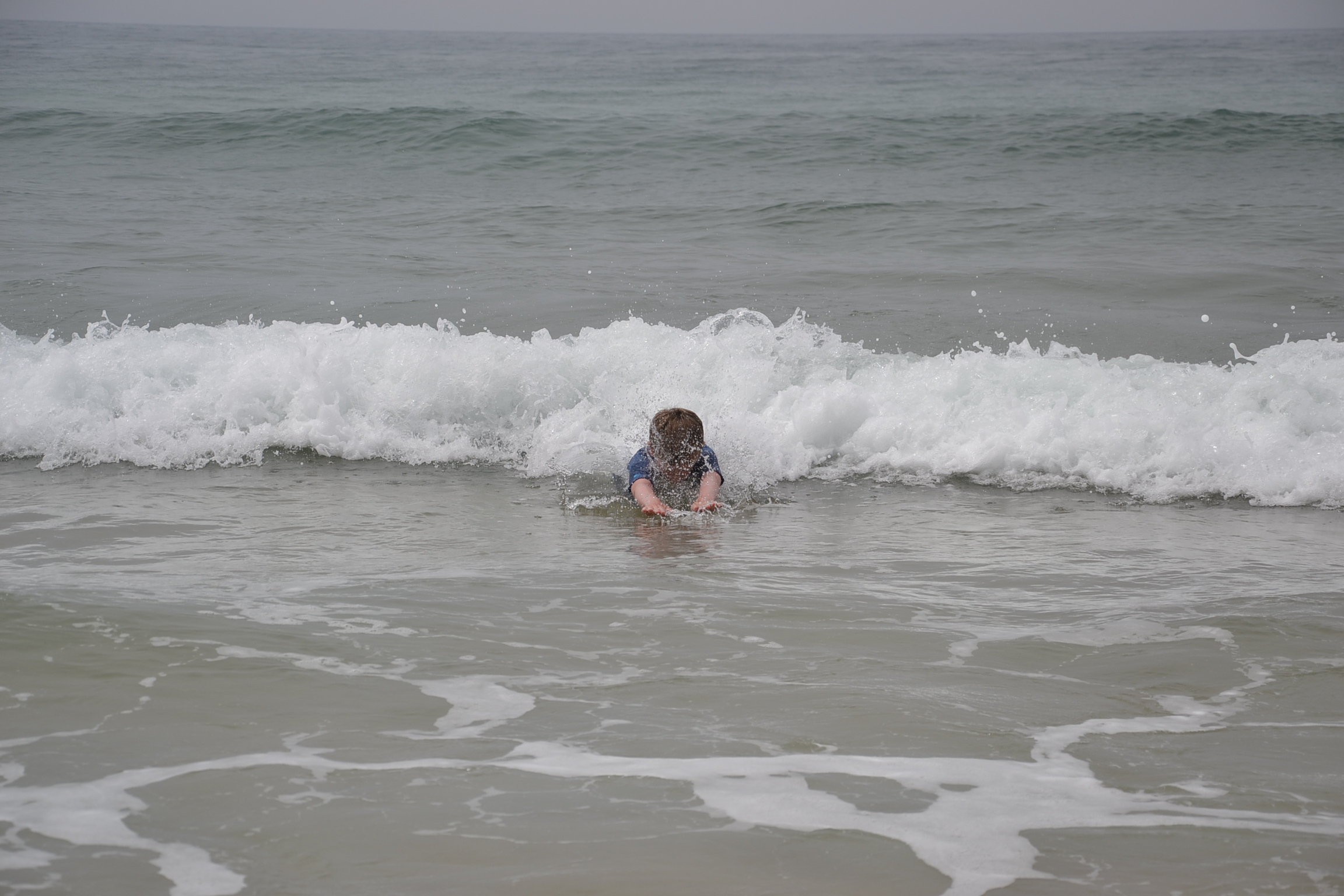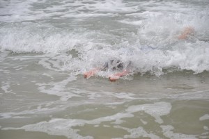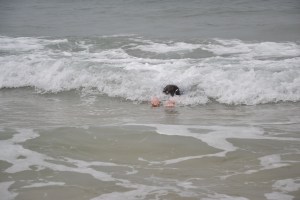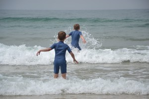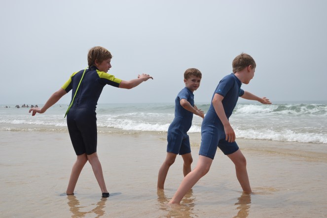 Et oui, en plus d’un parasol, d’un paravent, d’un ballon de foot, des attelles de nuit de Quentin, nous avons caché au fond d’une sacoche des combinaisons! Je vous laisse imaginer le poids une fois mouillées…