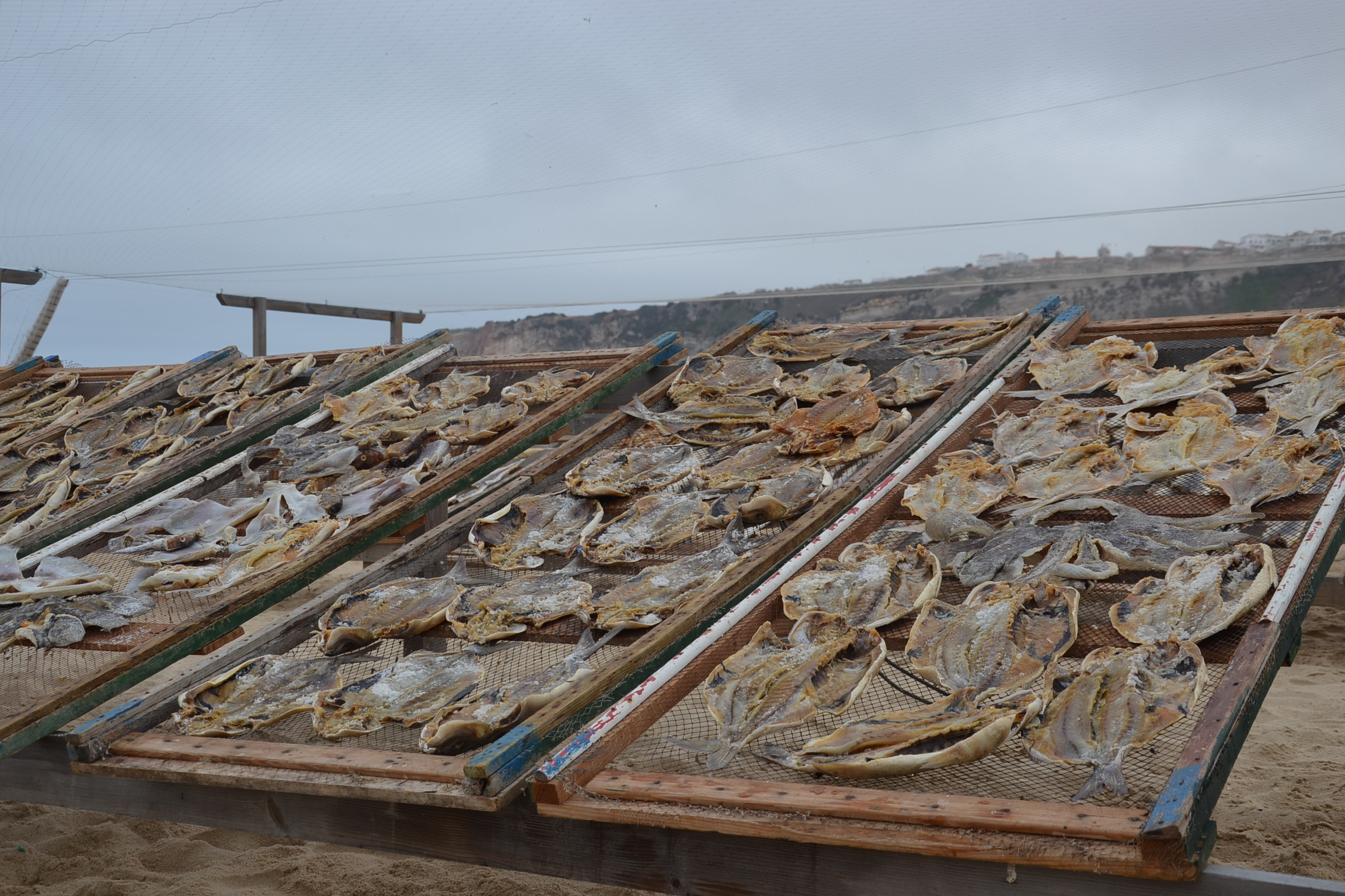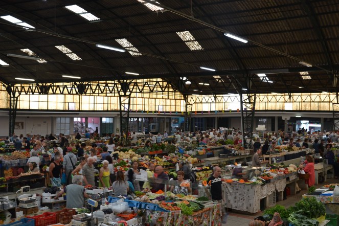 Partis des hauteurs de Nazaré, nous nous sommes laissés glisser sur la pente menant tout droit à une étape dominicale incontournable : le marché couvert et ses étals de fruits, légumes, divine charcuterie et poissons frais, fumés, séchés.