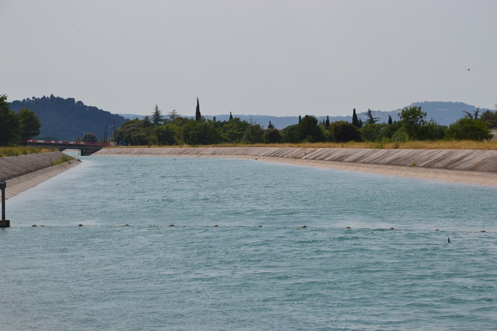 Rians, Jouques, après une longue sieste à l’ombre des arbres, nous rejoignons enfin le canal de Provence et sa longue ligne droite plate où un vent de face nous maintient à notre moyenne de 10km/h…