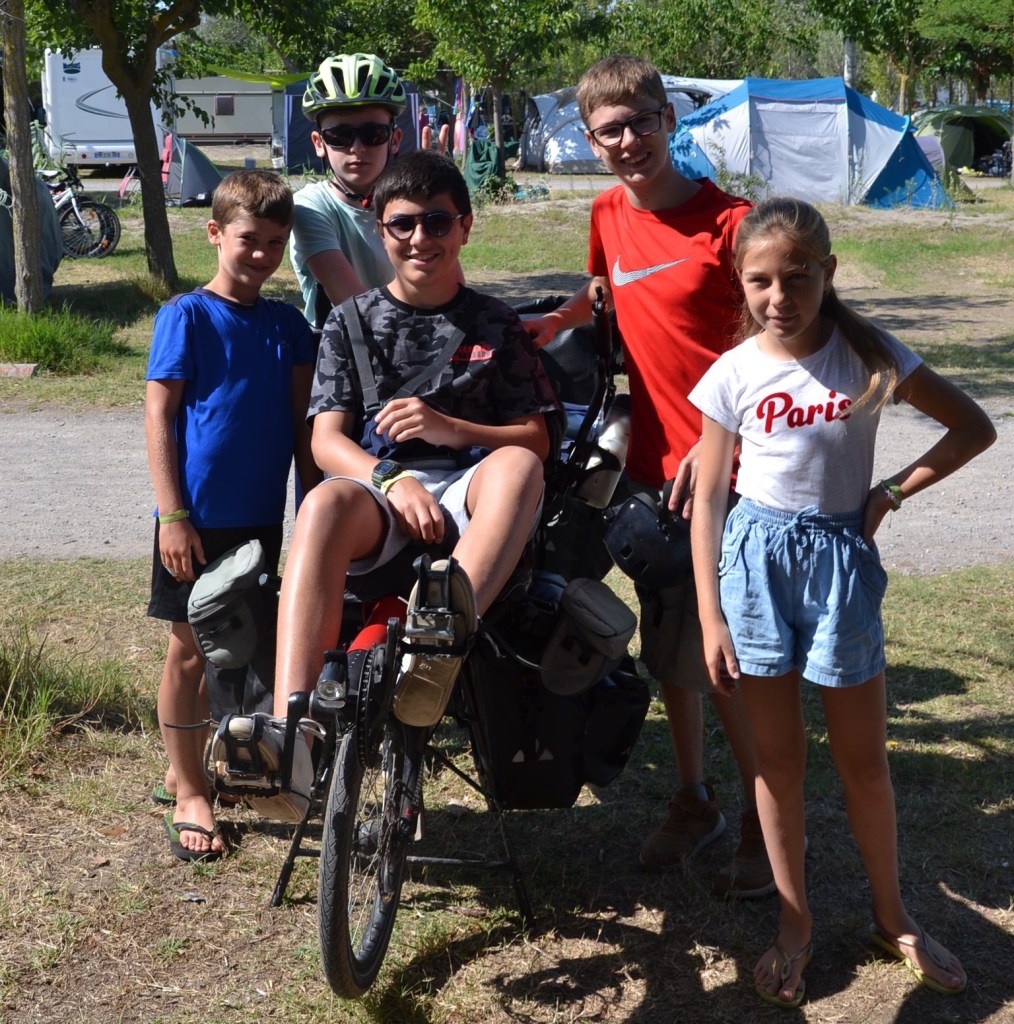 Nos vélos et leur drôle de chargement, nos drapeaux et le tandem suscitent souvent la même interrogation: