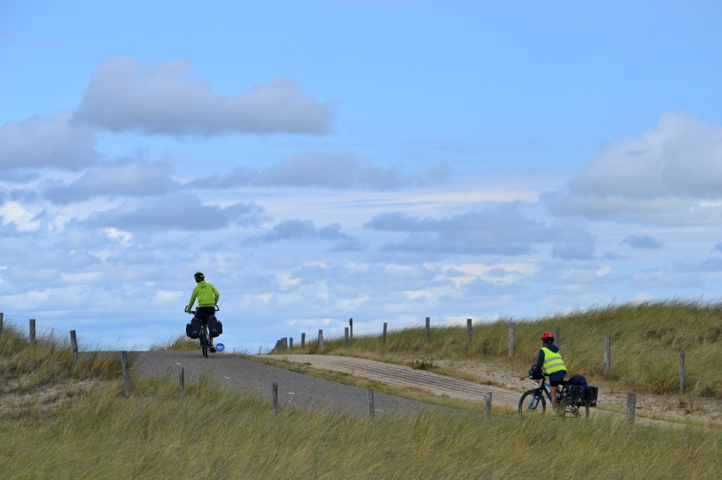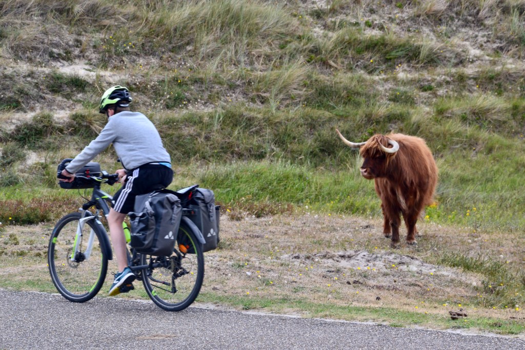 Aujourd’hui nous traversons la réserve des dunes de Hollande Nord, une des plus grandes du pays. Et comme tous les jours nous trouvons un réseau dense de pistes cyclables et de chemins de randonnées et des aménagements avec beaucoup d’humour!