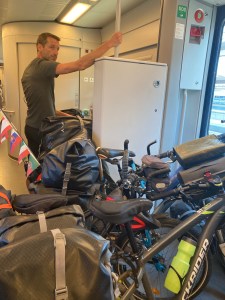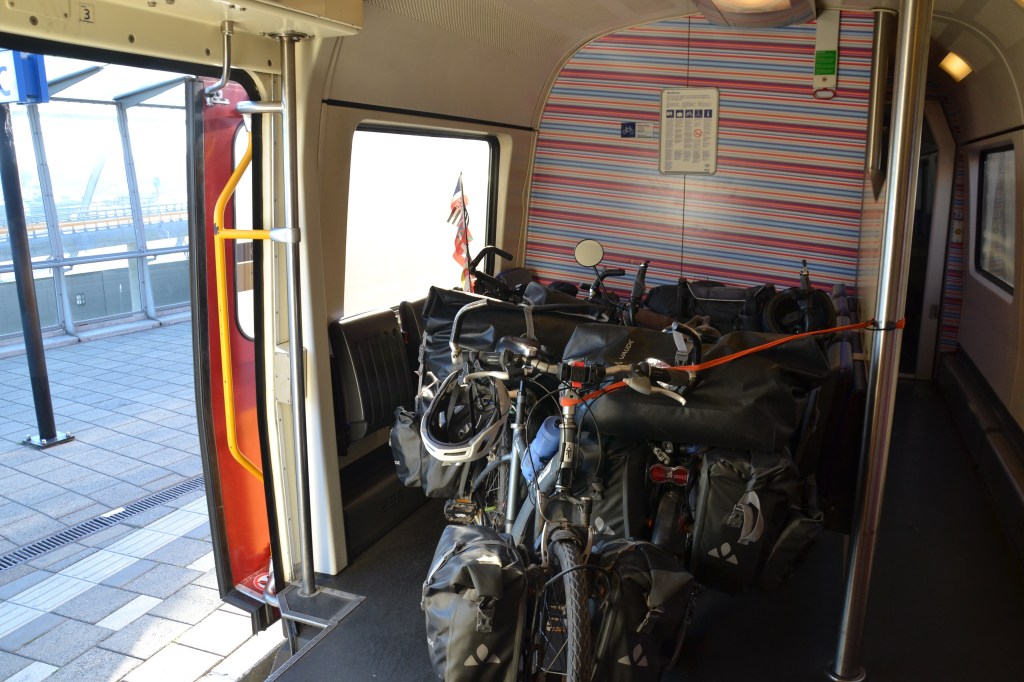 Suivi par 2 heures de voyage debout à tenir les vélos dans un compartiment qui devait sans doute être prévu pour des vélos pliants!