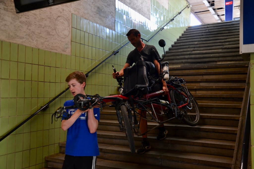 On décharge les sacoches, on porte les vélos… et on recommence pour remonter sur l’autre quai !