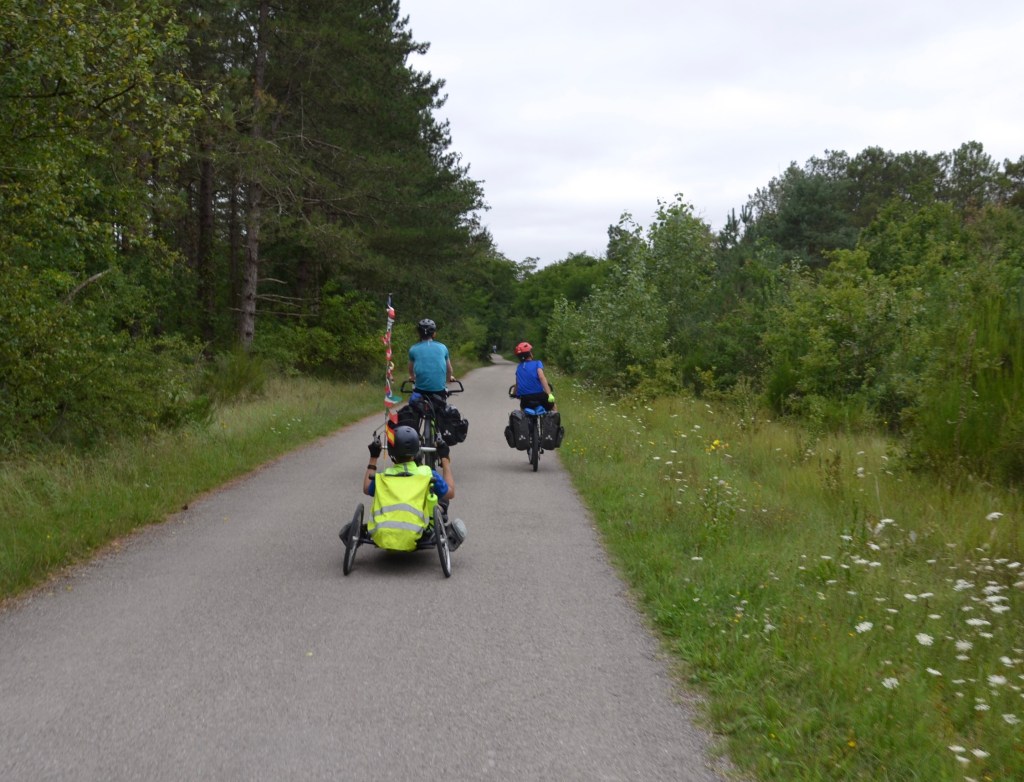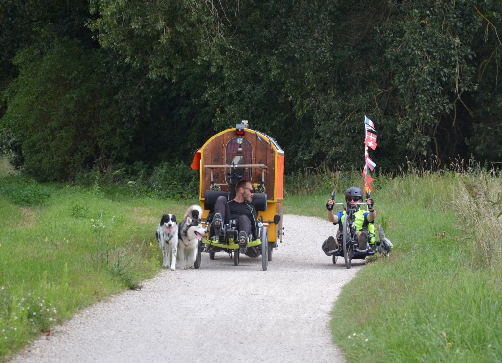 Autant vous dire qu’avec un vélo comme le handbike descendre d’un trottoir ou effectuer une chicane au bord d’une départementale où circulent voitures et camions est loin d’être sécurisé. Les 3 gars s’en sortent comme des chefs et nous retrouvons la tranquillité de la campagne.