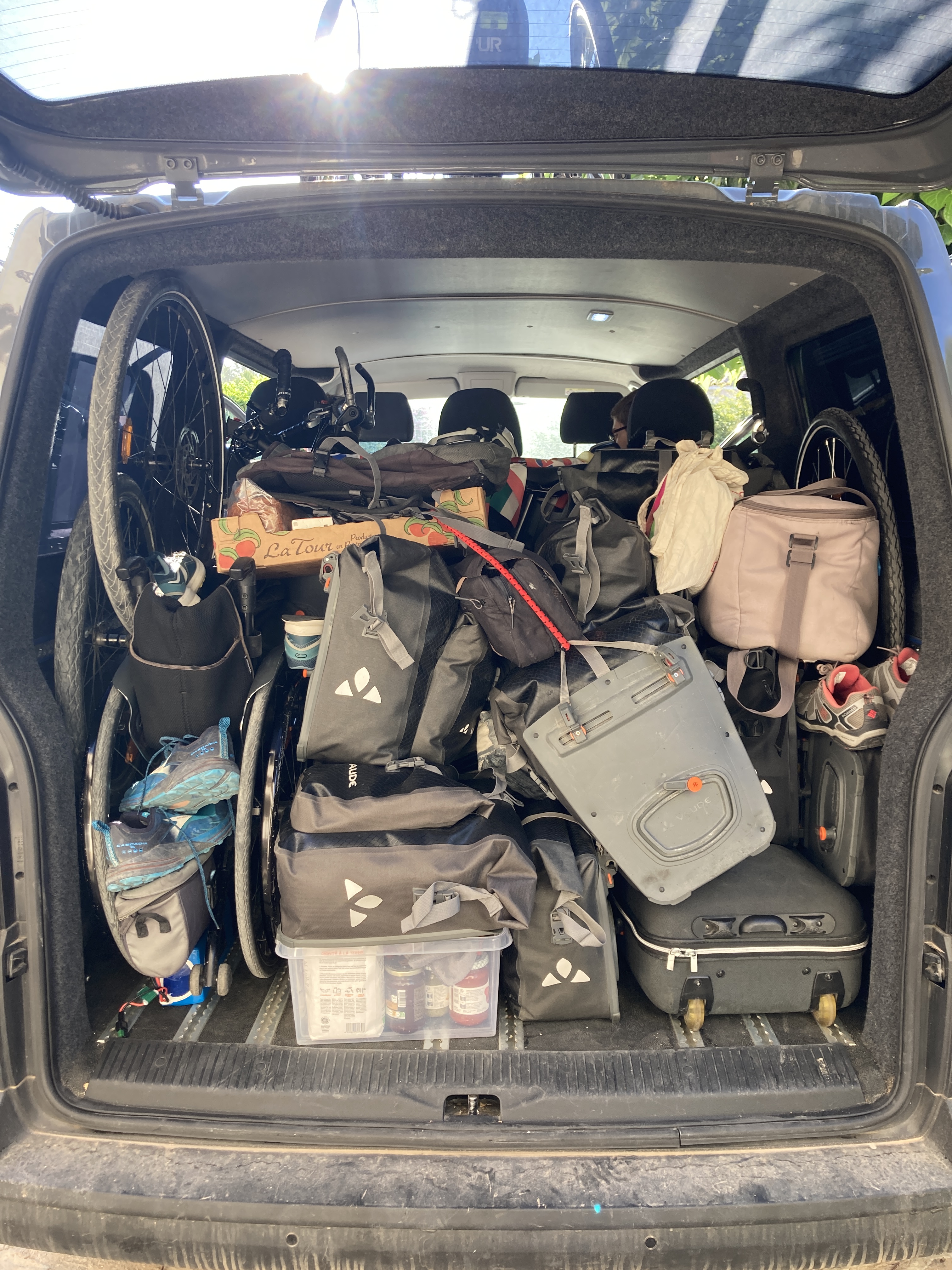 Passés maîtres dans l’art de faire rentrer un carré dans un rond, une baleine dans une boîte de sardines et surtout un lot de sacoches-vélos-fauteuilroulant-handbike-enfants dans un même habitacle, nous voici de nouveau sur les routes!