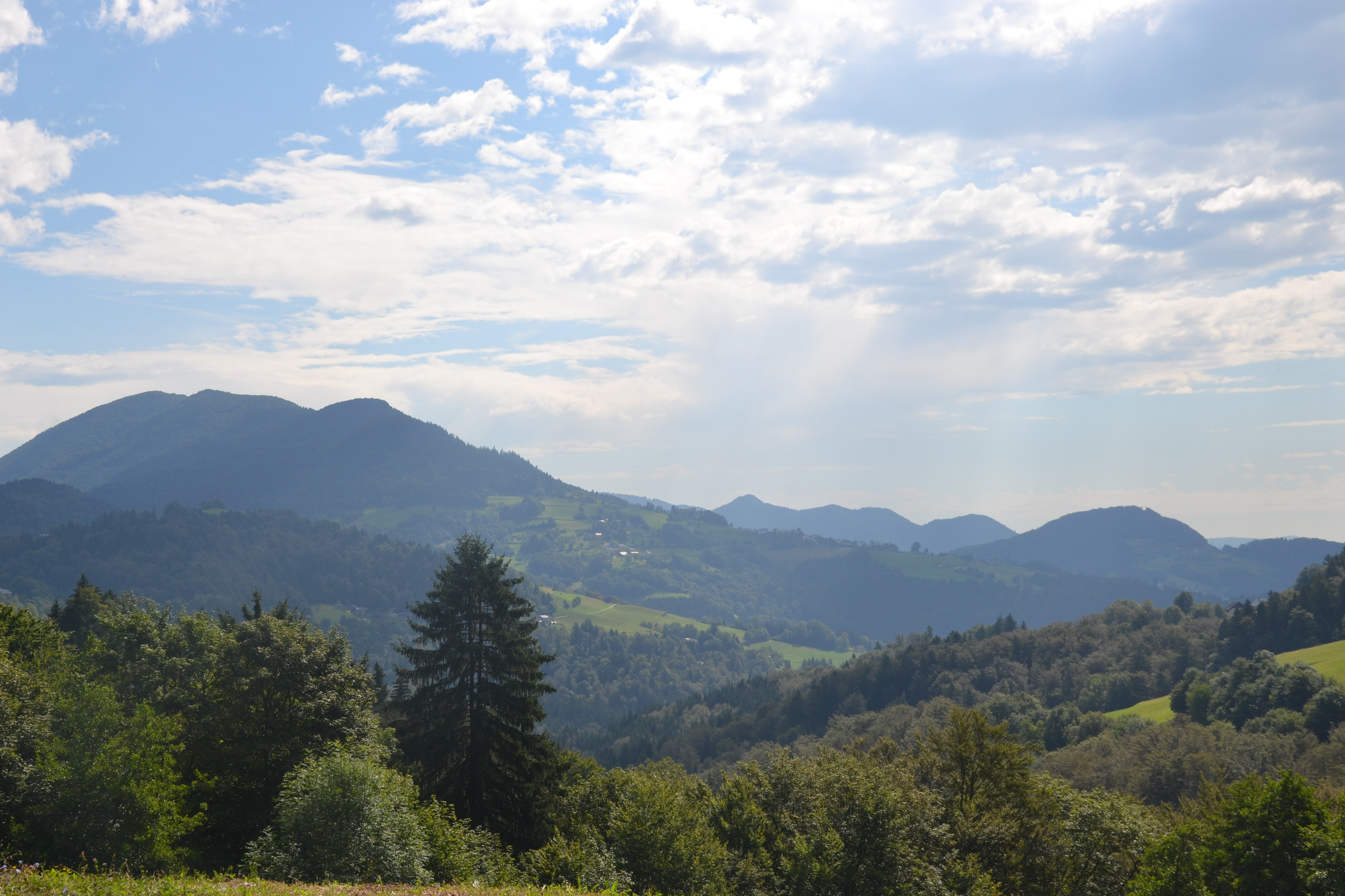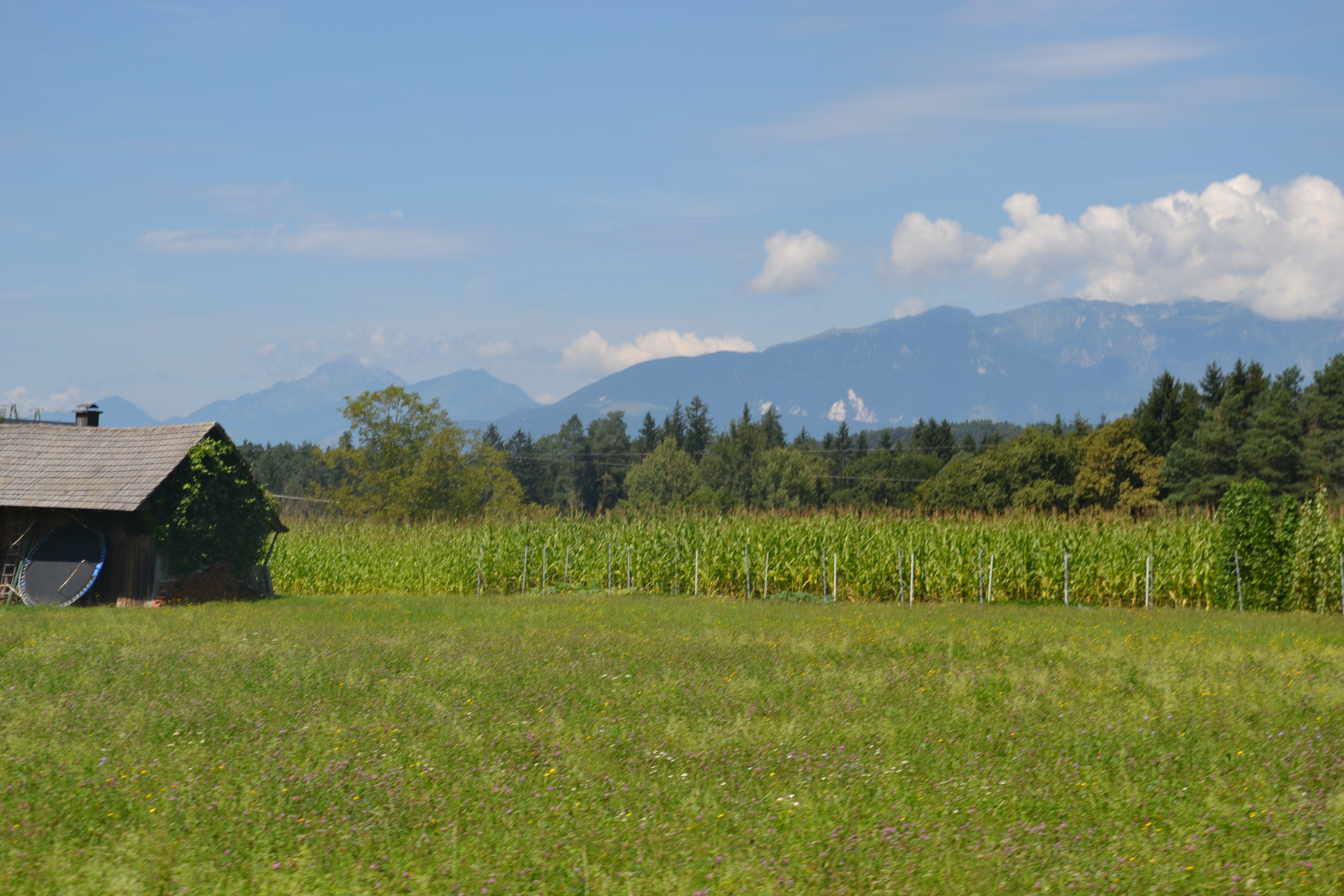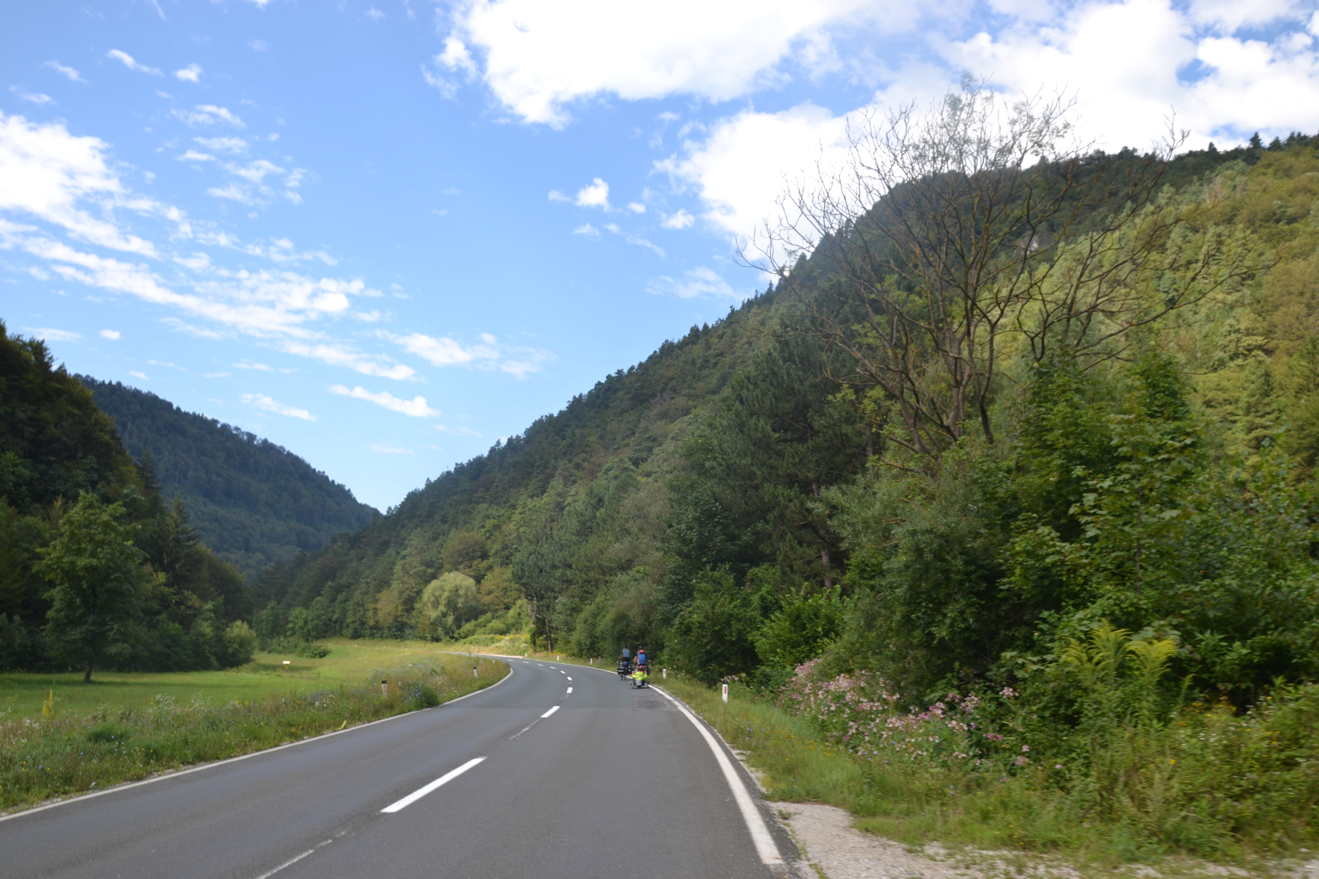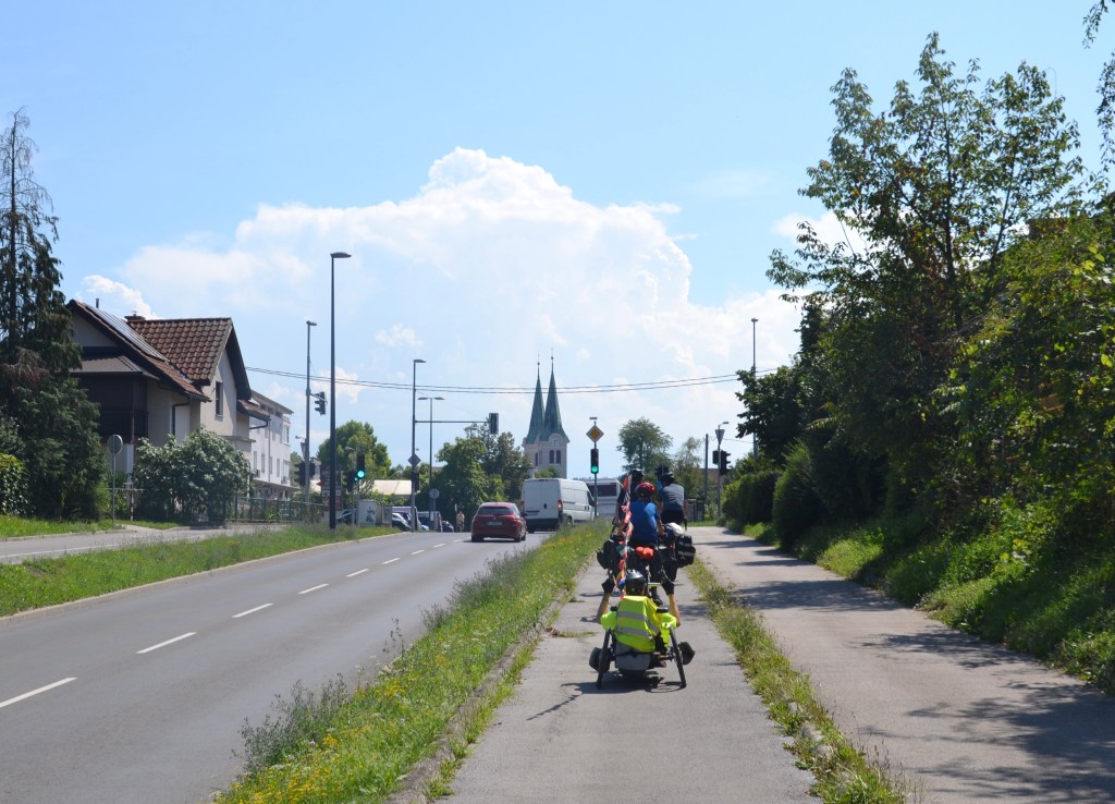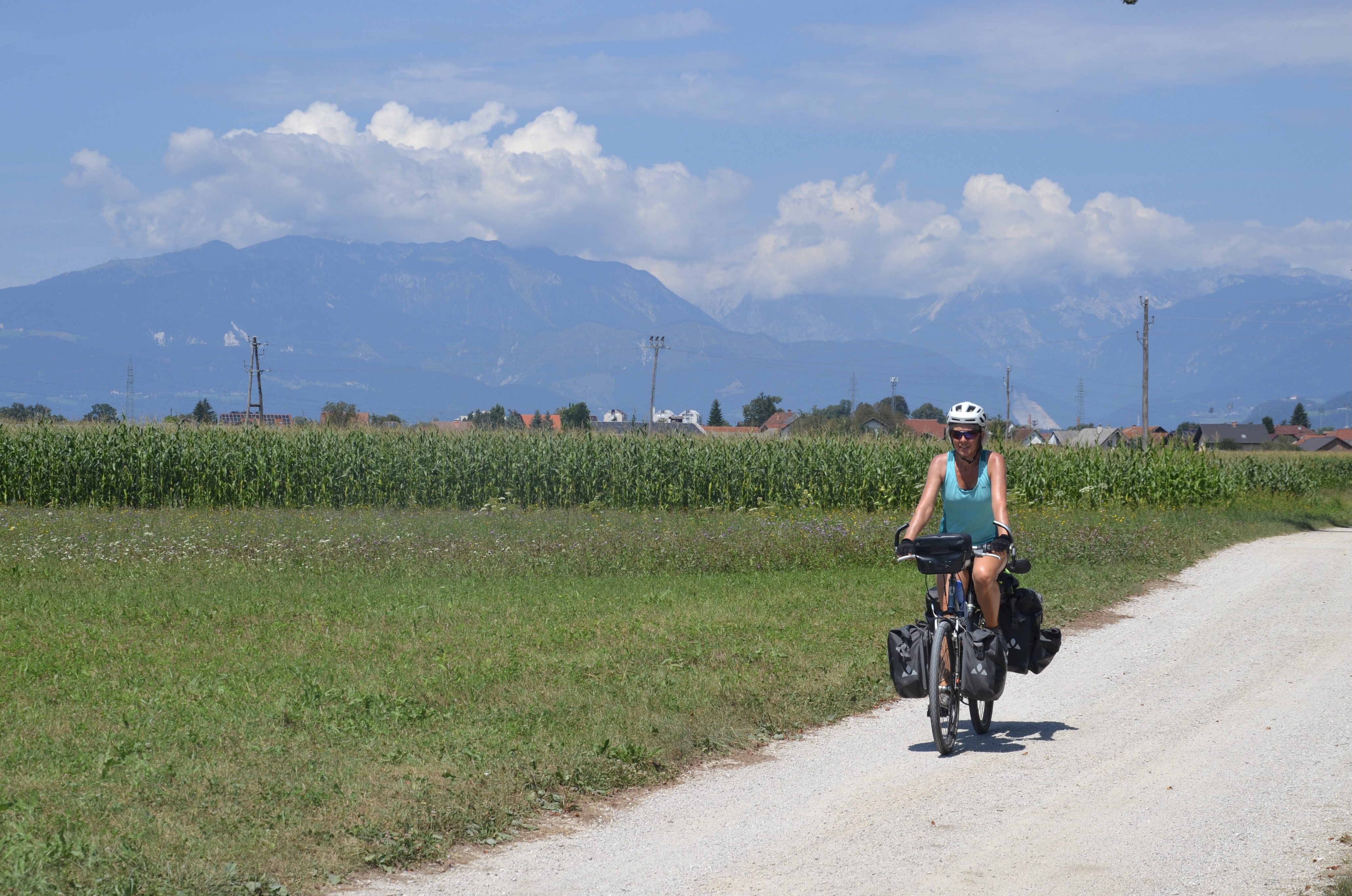 L’arrivée dans les faubourgs de Ljubljana se fait par un trottoir-cyclable en plein soleil. On s’échappe à nouveau par les petits chemins le long de la chaîne des Alpes Kamniques, situées à l’extrême est des Alpes Juliennes (Parc national du Triglav).