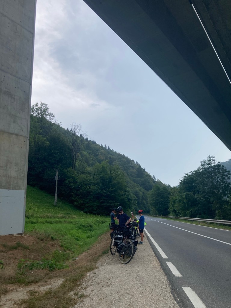 Nous nous élançons pour la dizaine de kilomètres de montée. Les premières gouttes tombent, nous trouvons un abri de fortune sous le pont de l’autoroute!
