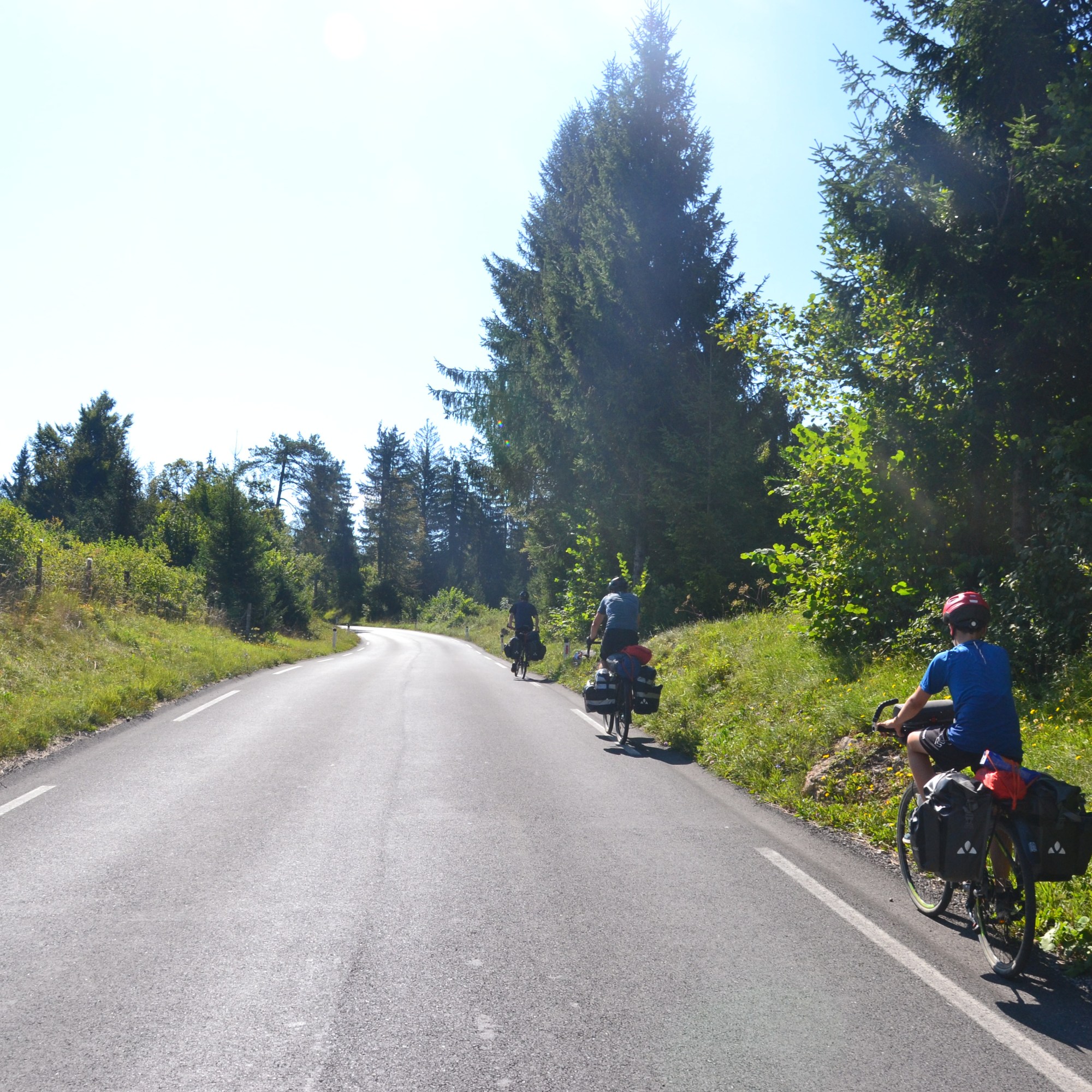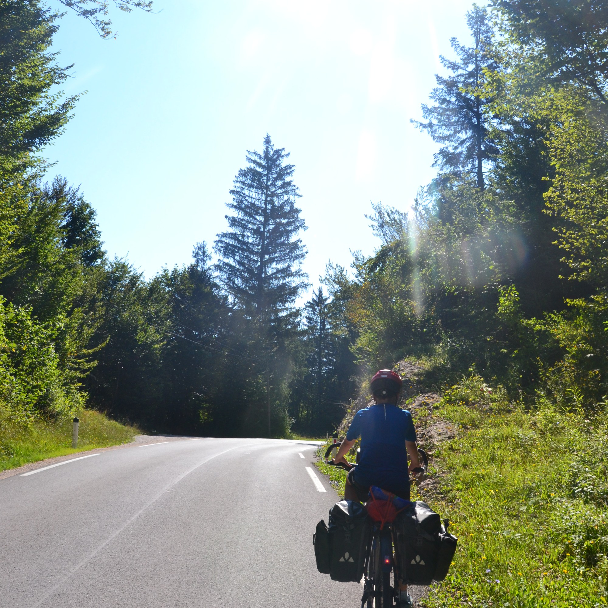 A droite, à gauche, devant, les montagnes accompagnent nos coups de pédales. Les paysages se modifient progressivement, les forêts de sapins sont toujours présentes mais de grandes falaises karstiques font leur apparition.