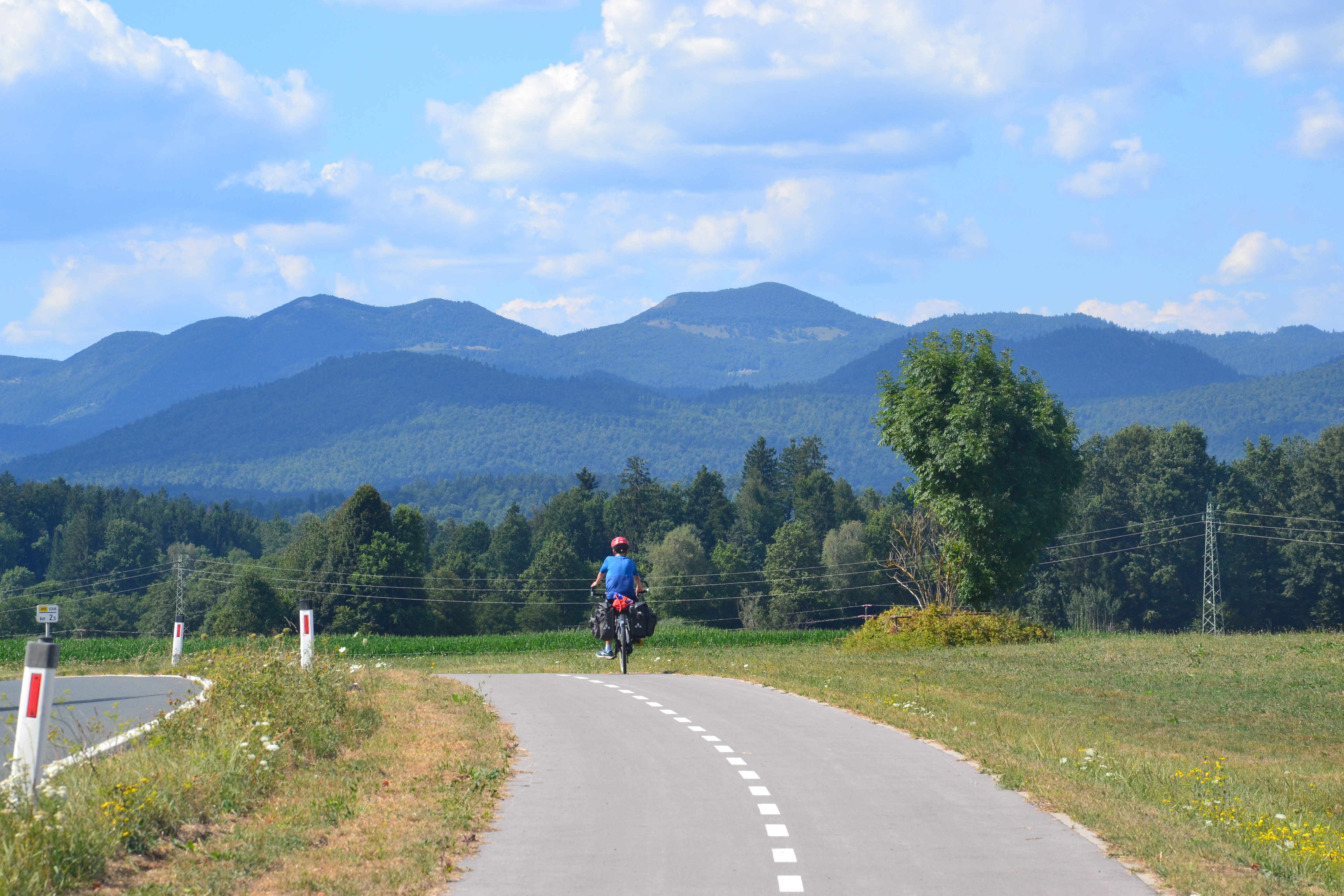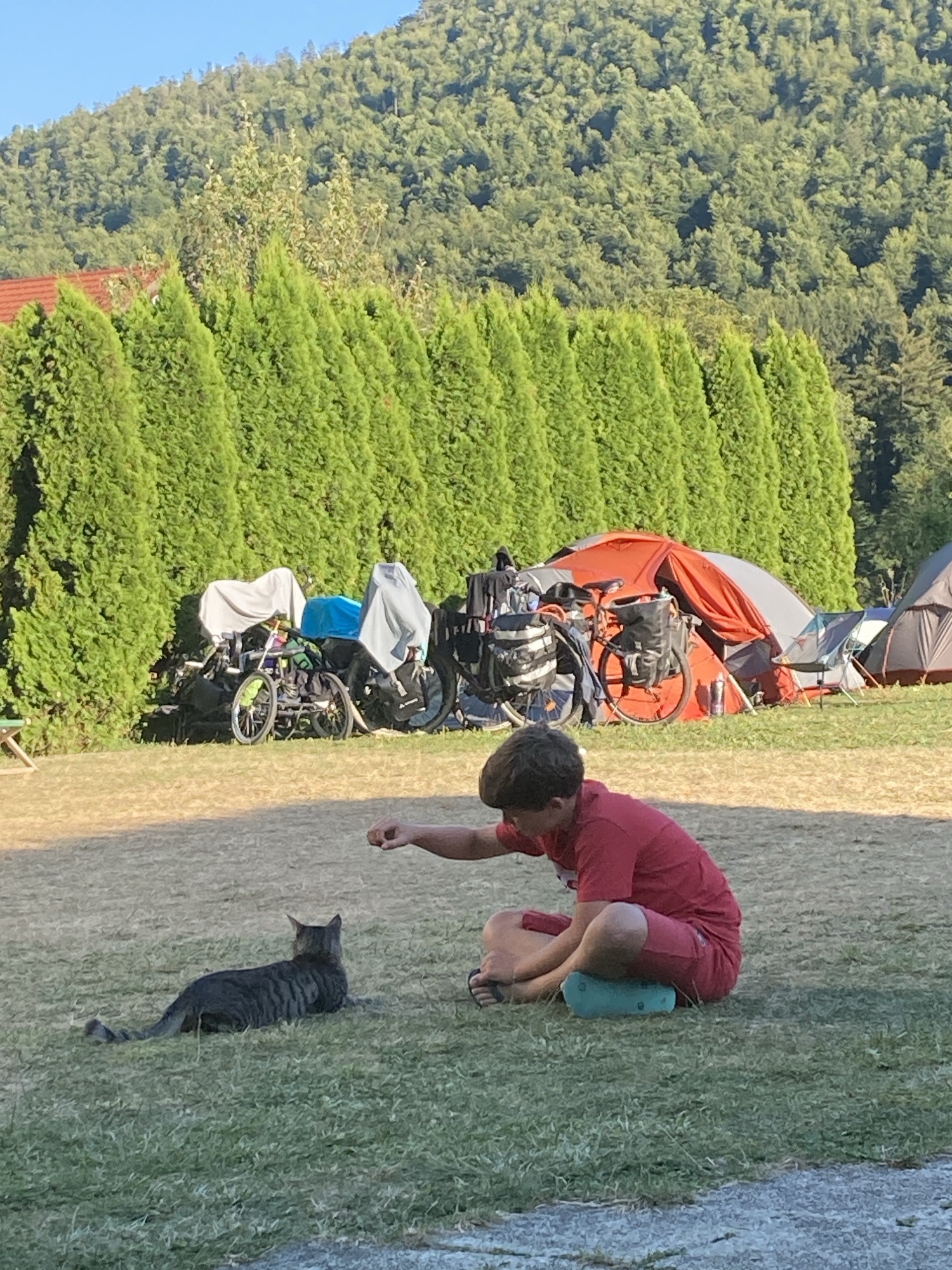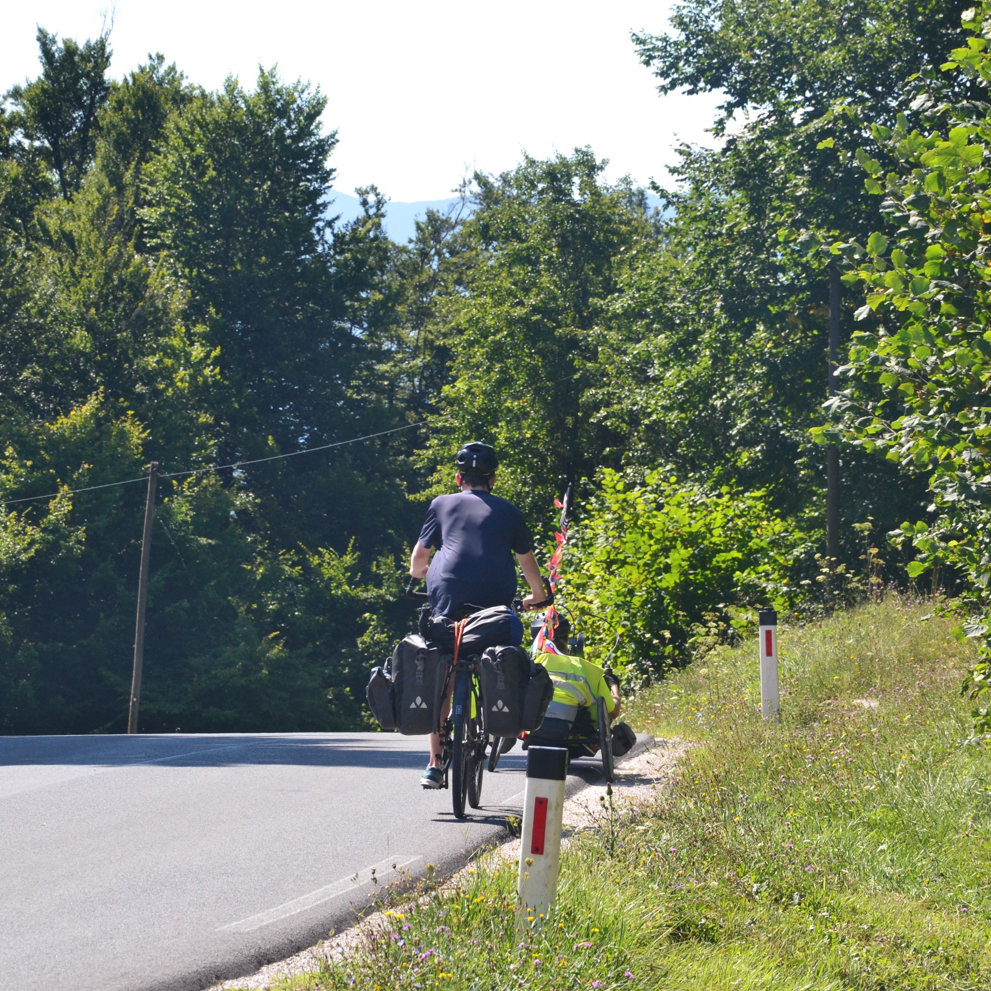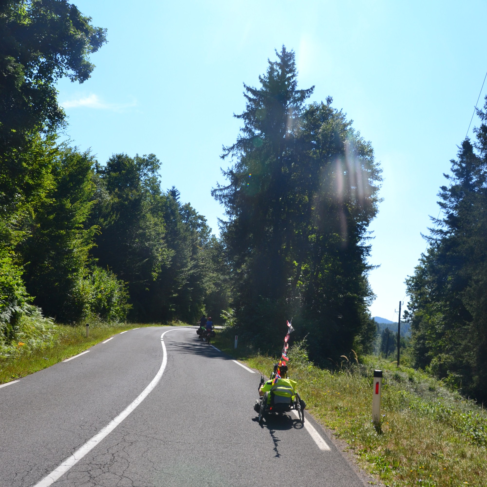 Cette petite route tranquille et peu passante aurait dû être l’itinéraire idéal… mais c’était sans compter sur un jeune cycliste arrêté pour un peu de fraîcheur et un rétroviseur un peu trop engageant dans un virage serré… le bruit fut très impressionnant pour la maman pédalant quelques mètres devant! Les nombreux trèfles à quatre feuilles cueillis la veille ont sans aucun doute servi de protection à Matthieu qui s’en sort miraculeusement avec un nouveau bleu dû au guidon ayant rencontré sa cuisse. Par contre, je ne suis pas certaine que les deux soeurs slovènes d’un certain âge s’en soient remises malgré toutes les prières adressées en anglo-franco-slovène à quelque divinité routière…