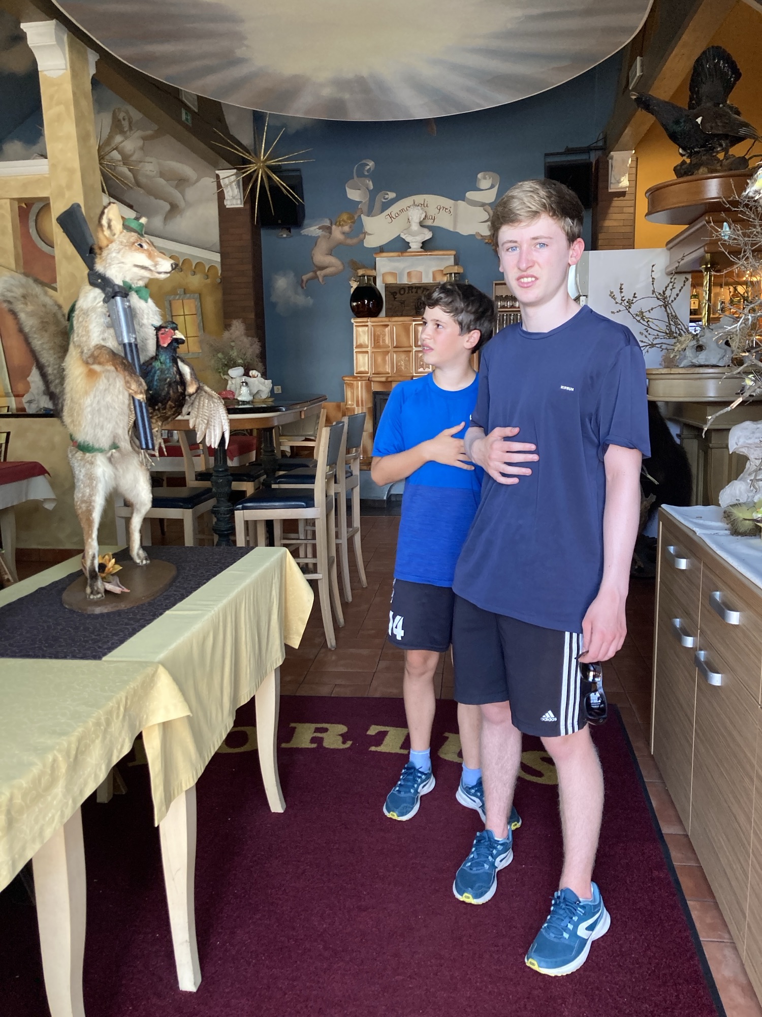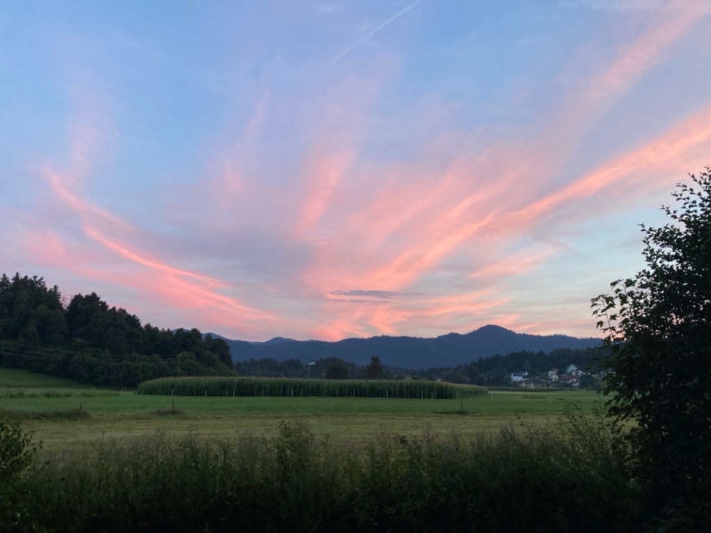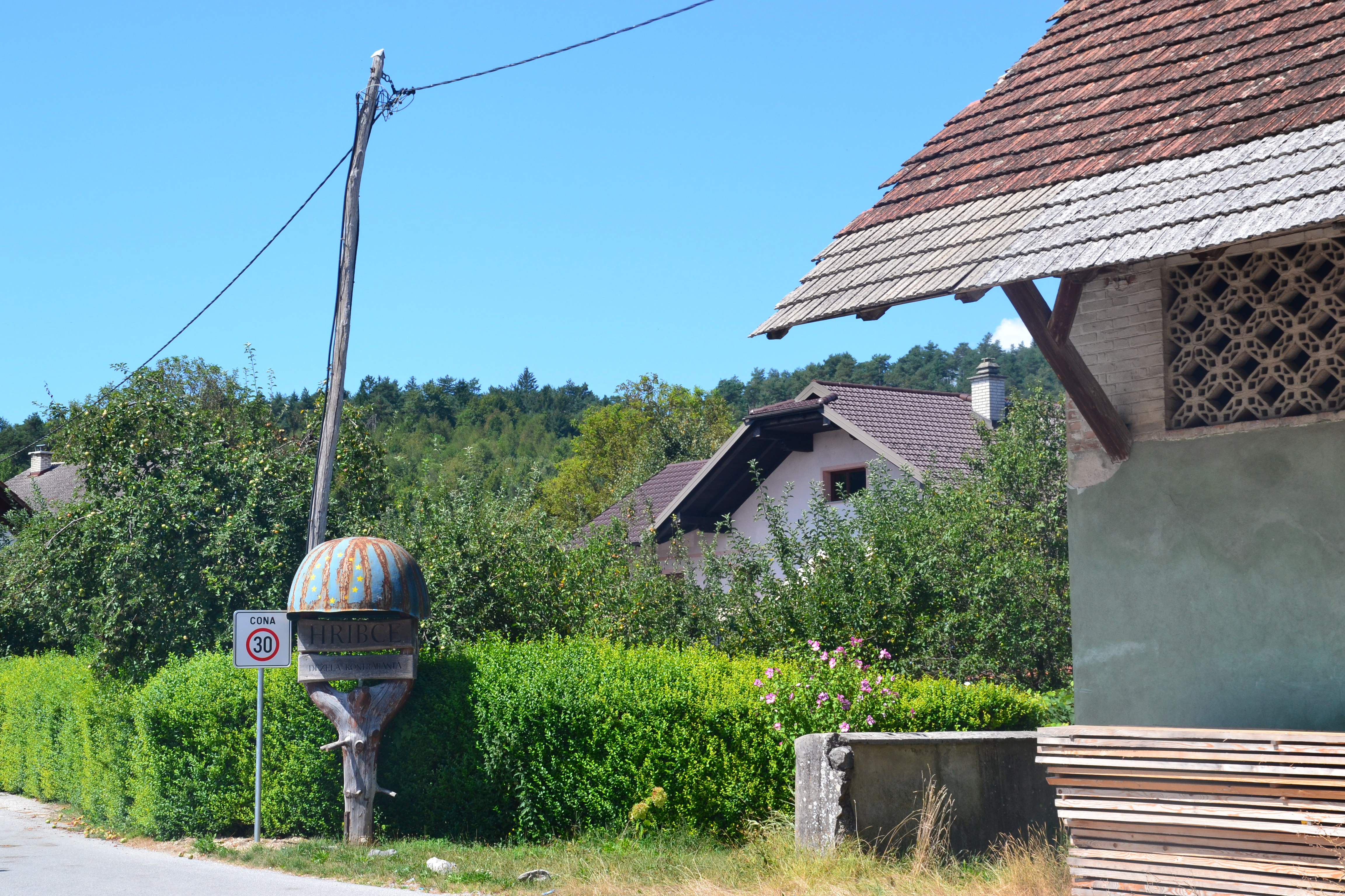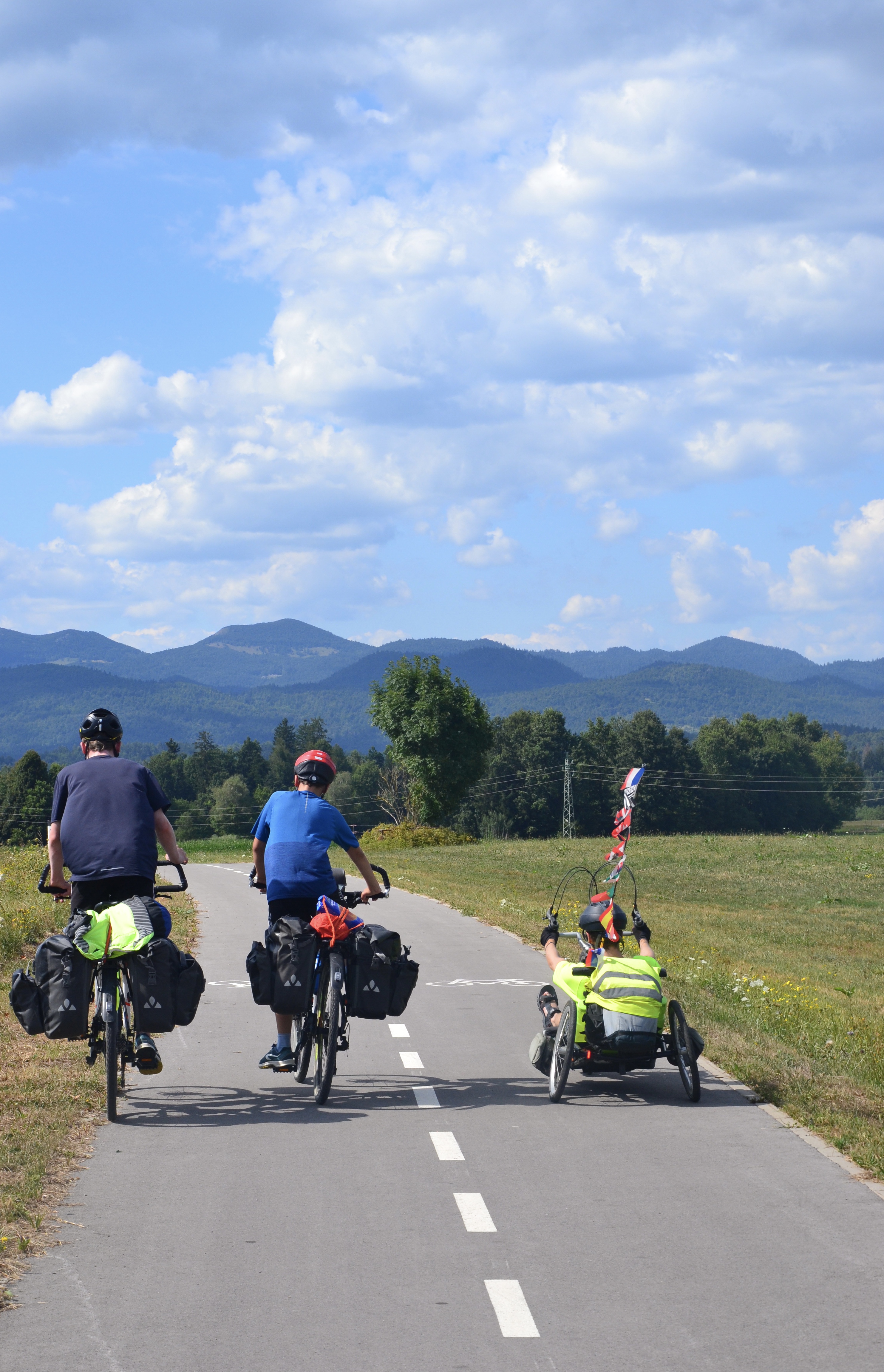 Cette petite route tranquille et peu passante aurait dû être l’itinéraire idéal… mais c’était sans compter sur un jeune cycliste arrêté pour un peu de fraîcheur et un rétroviseur un peu trop engageant dans un virage serré… le bruit fut très impressionnant pour la maman pédalant quelques mètres devant! Les nombreux trèfles à quatre feuilles cueillis la veille ont sans aucun doute servi de protection à Matthieu qui s’en sort miraculeusement avec un nouveau bleu dû au guidon ayant rencontré sa cuisse. Par contre, je ne suis pas certaine que les deux soeurs slovènes d’un certain âge s’en soient remises malgré toutes les prières adressées en anglo-franco-slovène à quelque divinité routière…