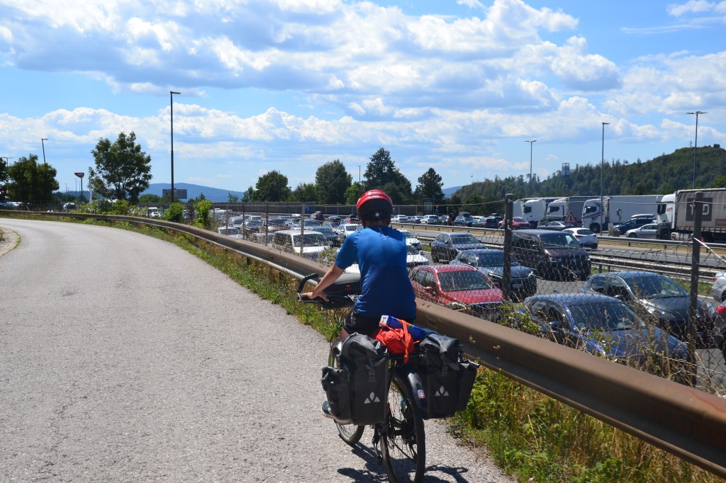 Réhydratés et reposés, nous repartons sur un bitume fondant sous la chaleur et longeons l’autoroute sur quelques kilomètres.