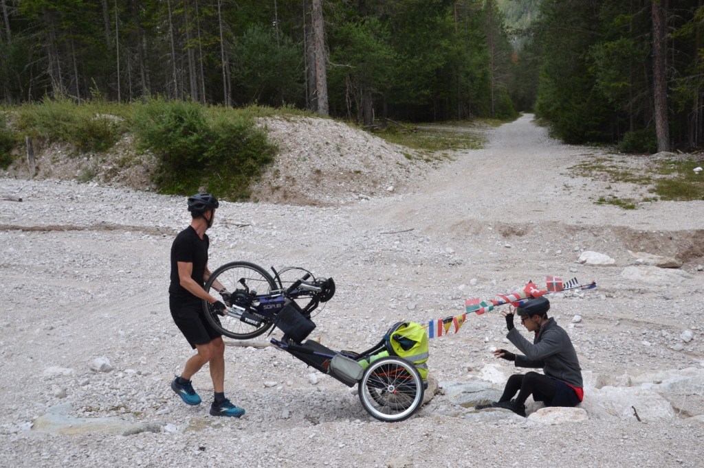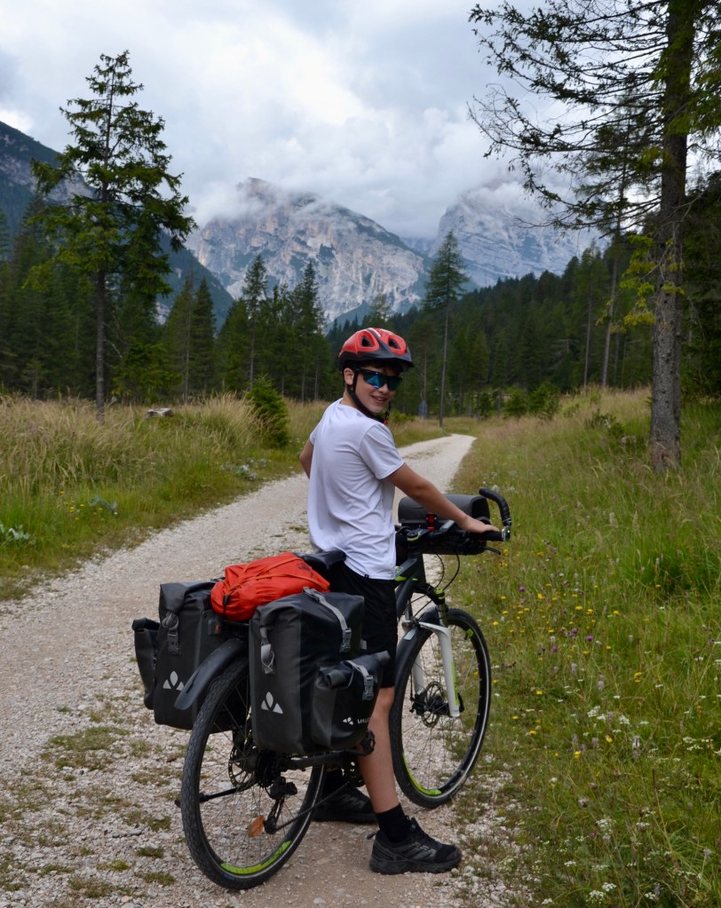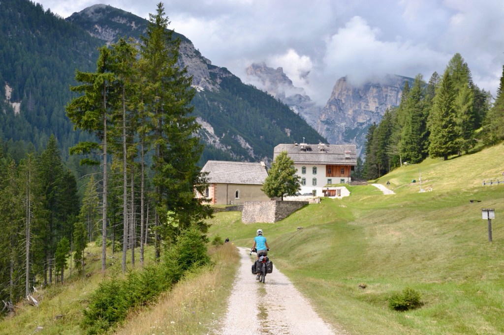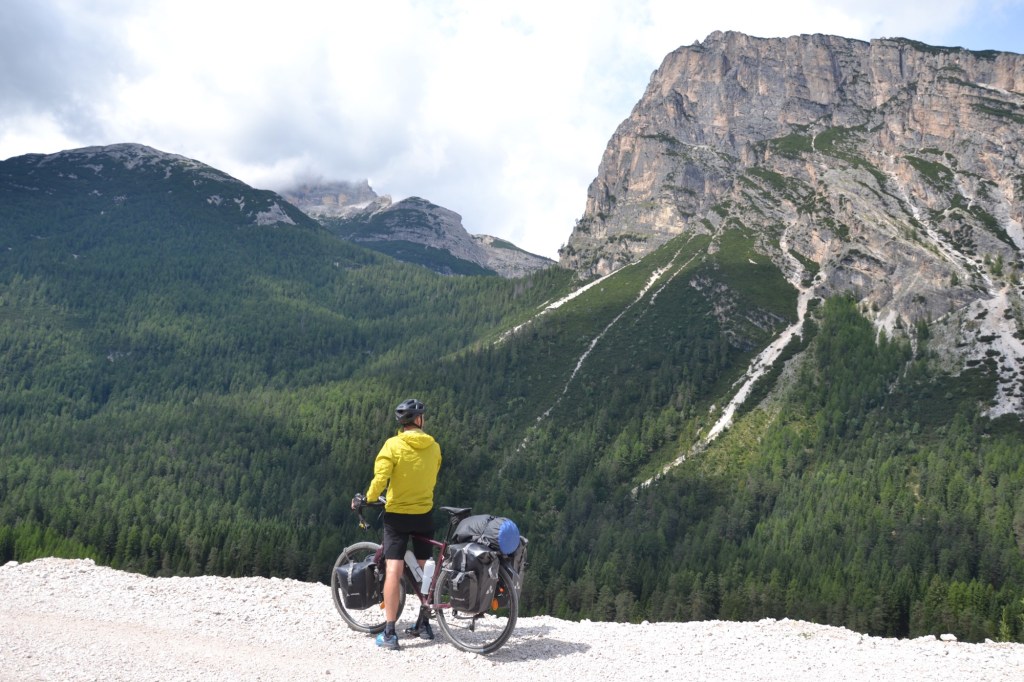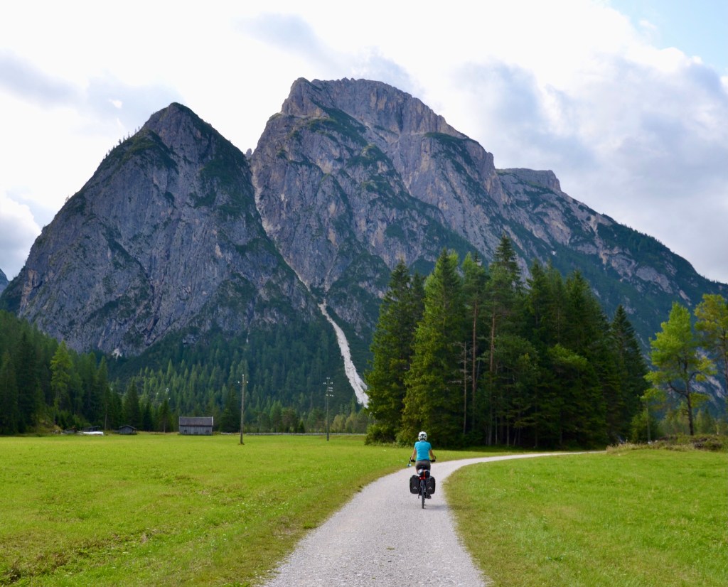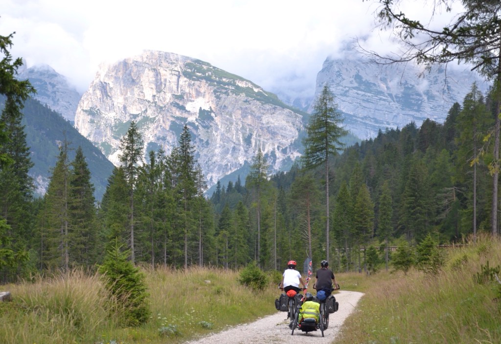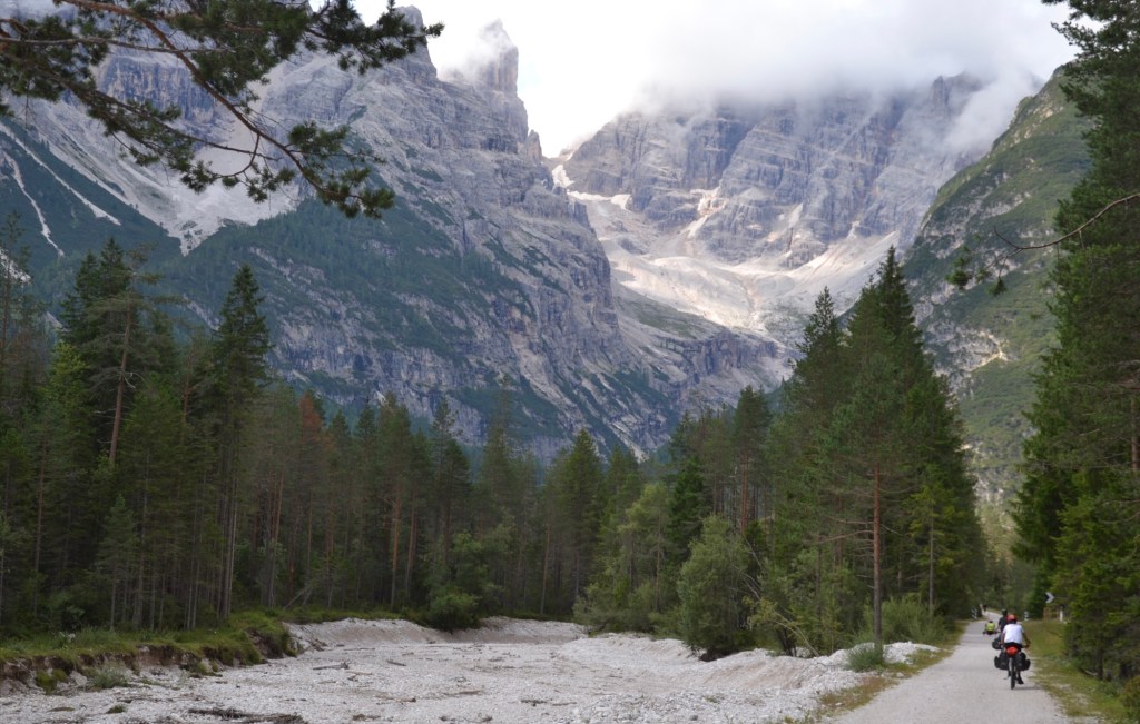 Nous nous arrêtons au point de vue sur les célèbres Tre Cime qui font tant vibrer les alpinistes. Elles se cachent dans la brume et ne se laissent que partiellement deviner. Qu’à cela ne tienne, nous laissons les groupes de randonneurs partir à leur assaut pour profiter de la piste cyclable en solo.