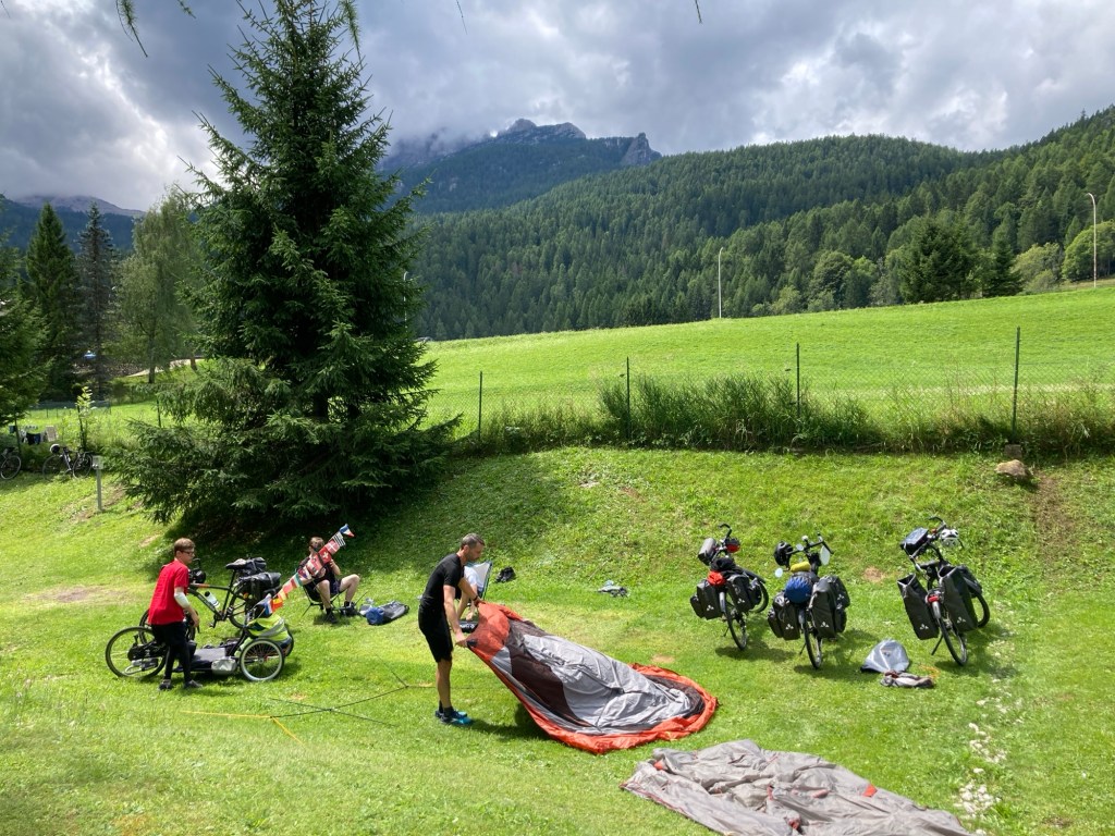 L’espace des tentes des randonneurs et des cyclistes s’agite un peu avant le lever du soleil. Certains partent à l’assaut des sommets et d’autres poursuivent leur route à pieds ou à bicyclette.