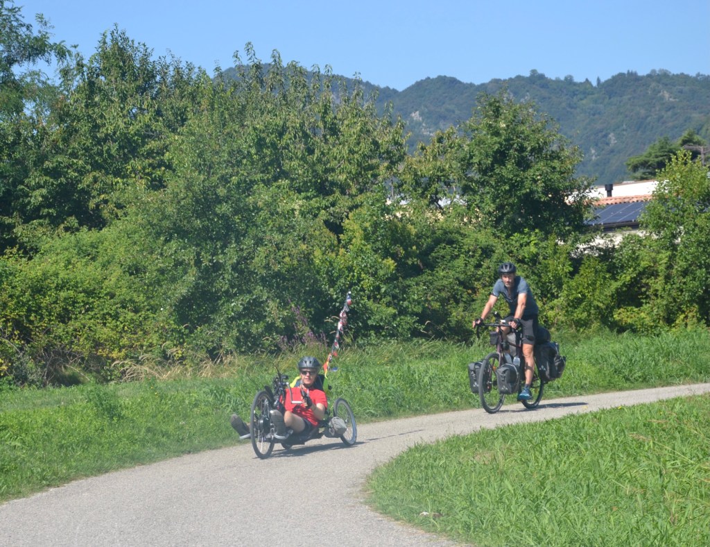 L’itinéraire cyclable n’en a que le nom, nous sommes beaucoup plus souvent sur des routes secondaires. Parmi les clichés, celui de la conduite italienne nous faisait craindre de partager la route. Nous sommes vigilants et cela se passe plutôt bien, les conducteurs s’écartent en nous doublant. Nous avons même le droit à quelques