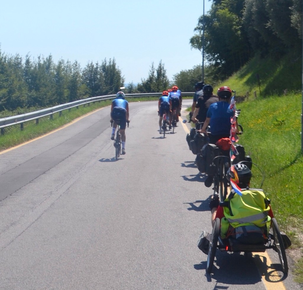 Nous nous faisons régulièrement doubler par des groupes de cyclistes italiens aussi rapides et pressants que leurs congénères motorisés! Nous nous rangeons soigneusement les uns derrière les autres pour laisser passer ces sportifs pressés.