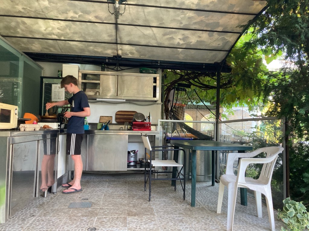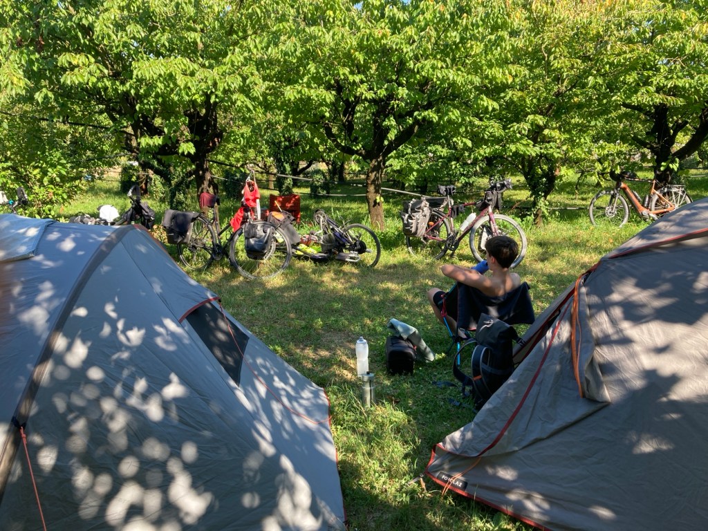 Nous dormirons sous les arbres fruitiers et partagerons ce campement avec d’autres cyclos, nous donnant l’occasion d’échanger sur nos voyages respectifs. Deux jeunes allemands s’inquiétaient de la possibilité de continuer leurs cyclo-voyages avec de futurs enfants. Je crois qu’ils ont été rassurés !!