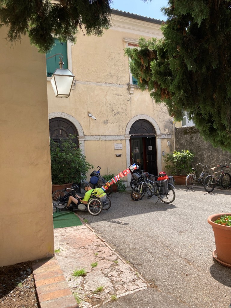 L’étape est roulante et majoritairement au frais. Sans cet arrêt dû à une crevaison du handbike (la première en deux ans!), nous serions arrivés pour un déjeuner tardif à Bassano del grappa.