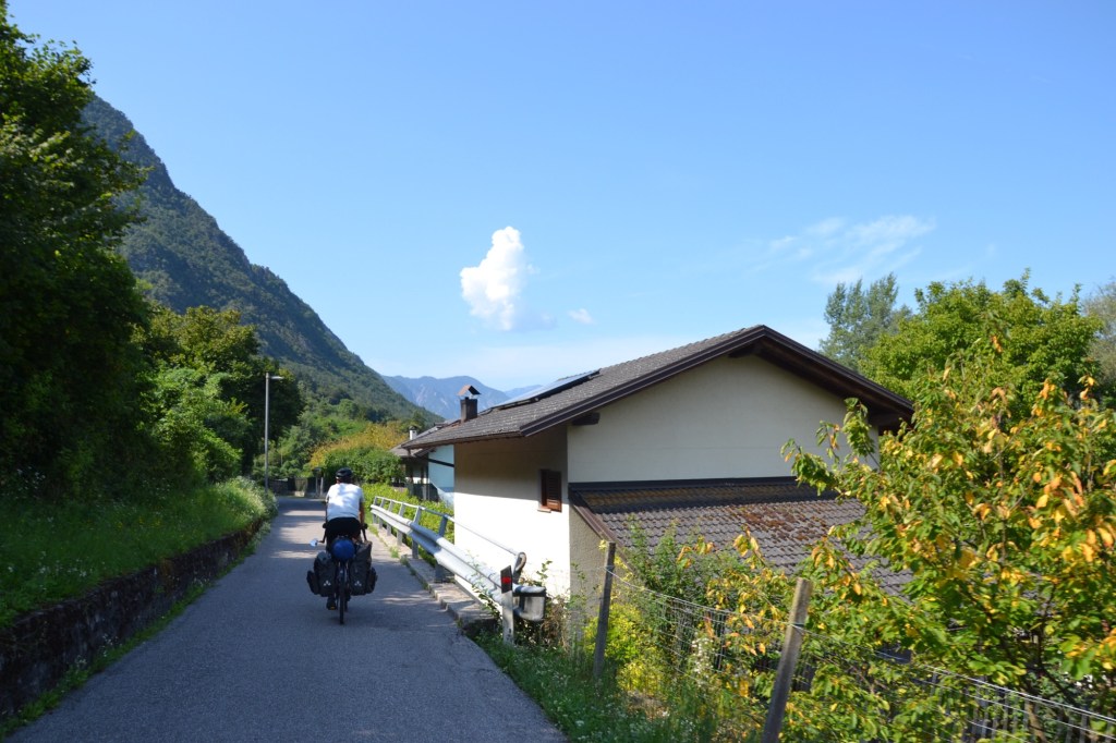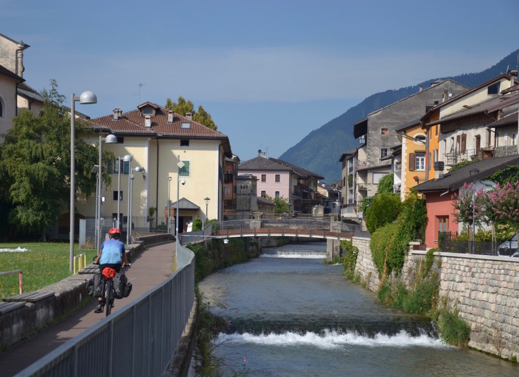 Les montagnes rocheuses surplombent toujours la vallée de la Brenta qui s’élargit et de ce fait s’urbanise un peu. Des parapentistes nous survolent, la vue doit être magnifique de là-haut.