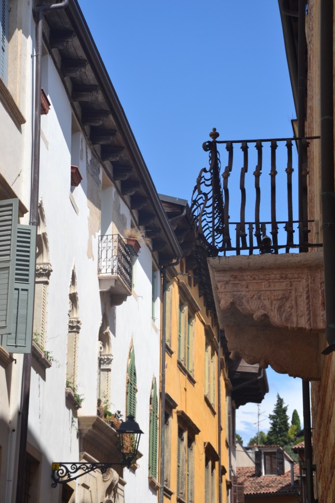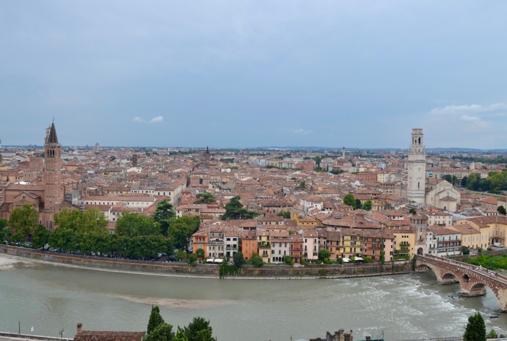 Délestés de nos sacoches et de nos vélos, et à nouveau muni d’un fauteuil roulant, nous arpentons la ville de Roméo et Juliette en jouant à cache-cache avec les nuages et les averses.