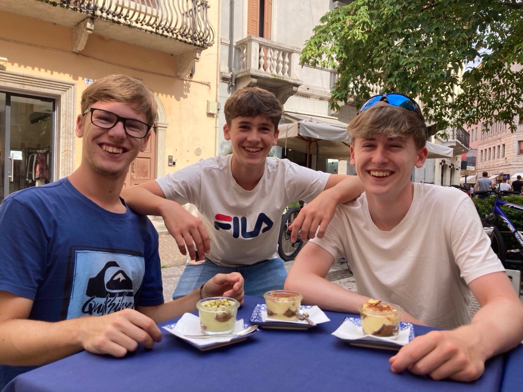 Quelques années et tours de pédales plus tard, c’est à Vérone, avec un petit jour d’avance, que Matthieu souffle ses 14 bougies avec un tiramisu et ses frangins!